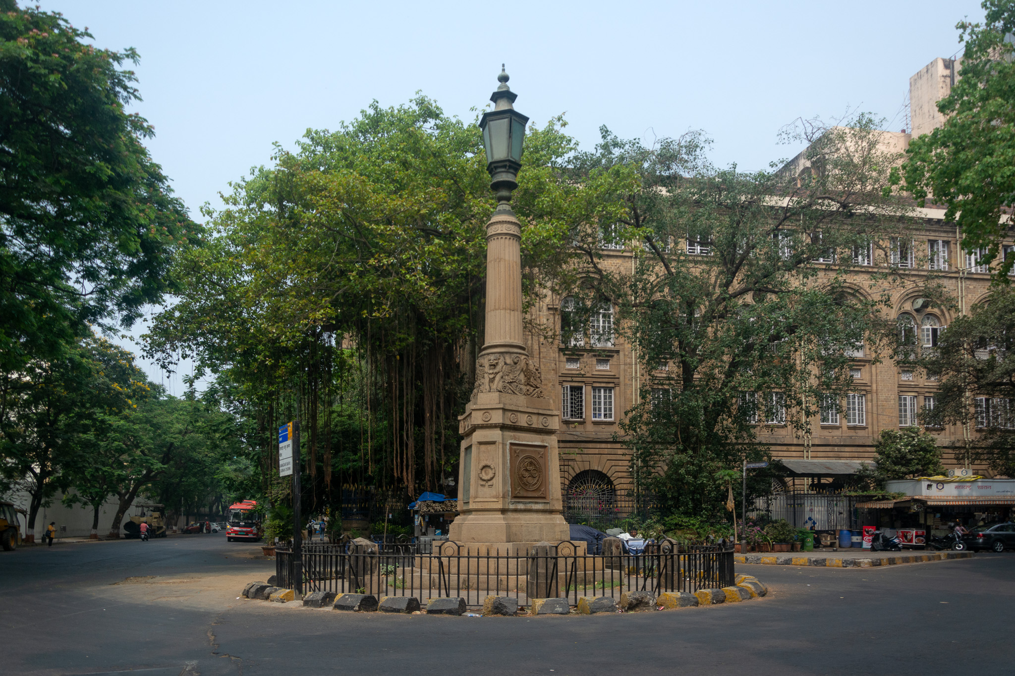 The Port Trust War Memorial was installed in 1919 as a traffic roundabout, located at the junction of three streets; SS Ramgulam Road, N Morarji Road, and Shoorji Vallabhdas Road. The pedestal is irregularly hexagonal, with commemorative plaques fixed on the three larger sides. The pedestal supports a circular, fluted column crowned with a metal lamp on top.