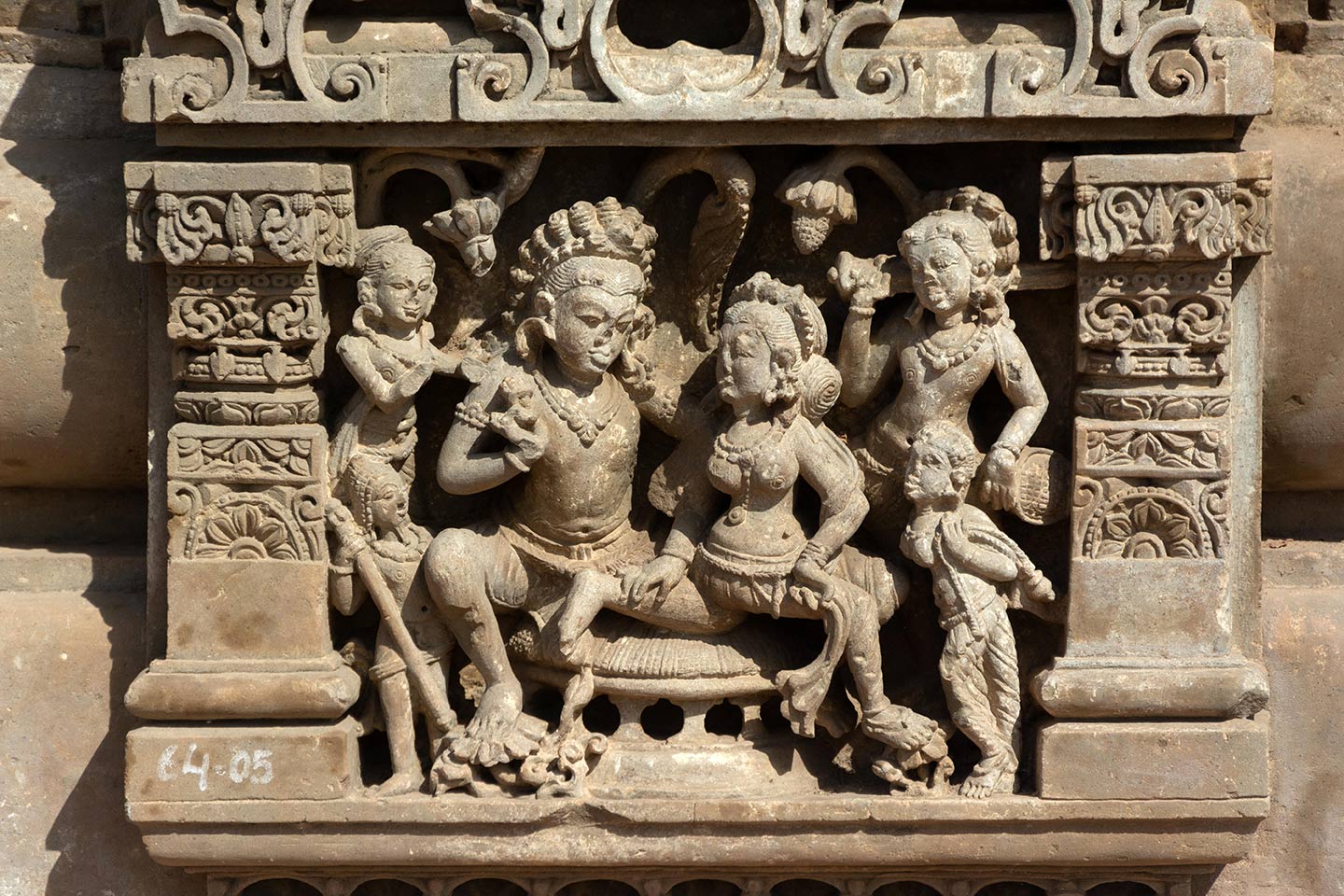 Couples invoking shringara rasa (associated with romance, love, and attractiveness between lovers) are framed in panels with pillars and tiered shikhara with gavaksha (horseshoe) motifs. Unlike other sections of the temple, the faces of the couples are not damaged and they are wearing heavy jewellery, elaborate hairstyle, and garments, indicating their royal lineage. The central male figure is seated in the lalitasana pose on a raised seat. The central female figure is seated on his thigh, looking towards the man with her head turned. Both rest their right feet on blooming lotus flowers. The man is holding a flower in his right hand while the woman gently rests her right hand on his left foot. Trees in the background suggest they are in a grove. The couple is surrounded by four male and female attendants. The female attendant in the top right is larger and is holding a sword in her right hand, indicating she is a warrior.