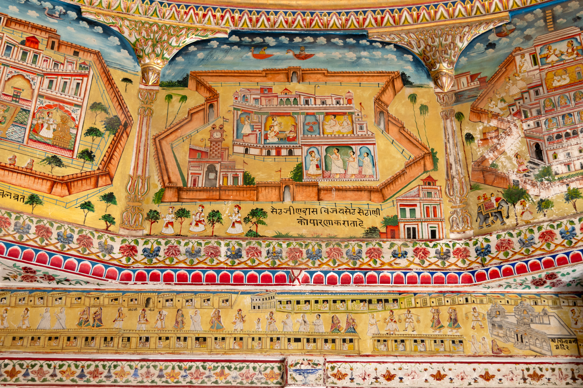 Seen here is the story of Vijay Seth and Vijay Sethani, a couple who maintained the vow of celibacy throughout their life. The painting, on the ceiling of the mandapa (pillared hall) of the Bhandasar Temple, depicts a grandiose haveli with an enclosure where the couple resides. The painting has an inscription that reads, ‘Sethajidas Vijayseth Sethani ko Parna karata hai’.