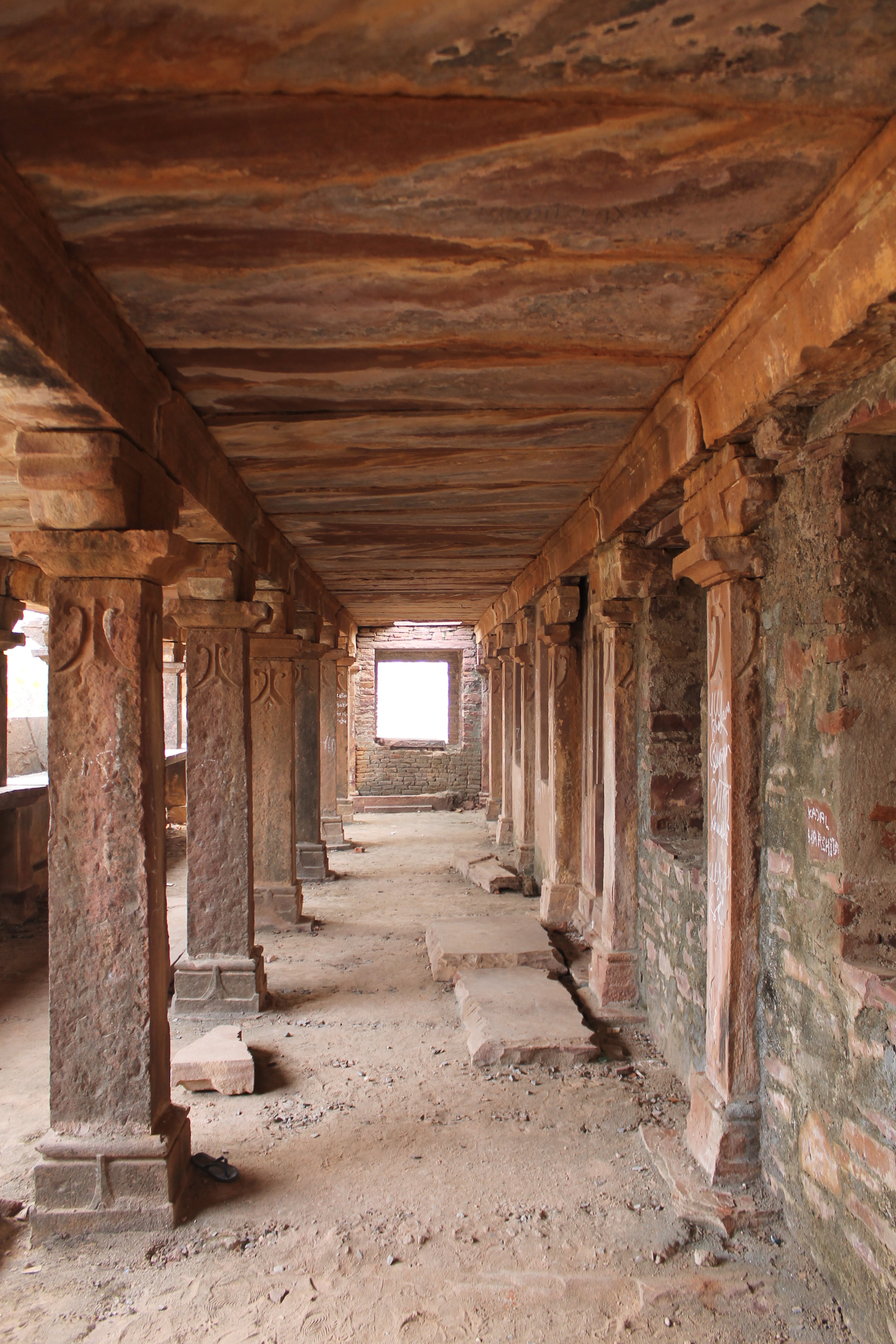 The colonnade on the upper floor of the matha (monastic or residential) in the Suhaveshwar temple complex can be seen here. The colonnade is connected at both its east and west ends. There are a few rooms on the south side of the floor. This floor is reachable via a staircase, now dilapidated, which is in the eastern corner of the matha.