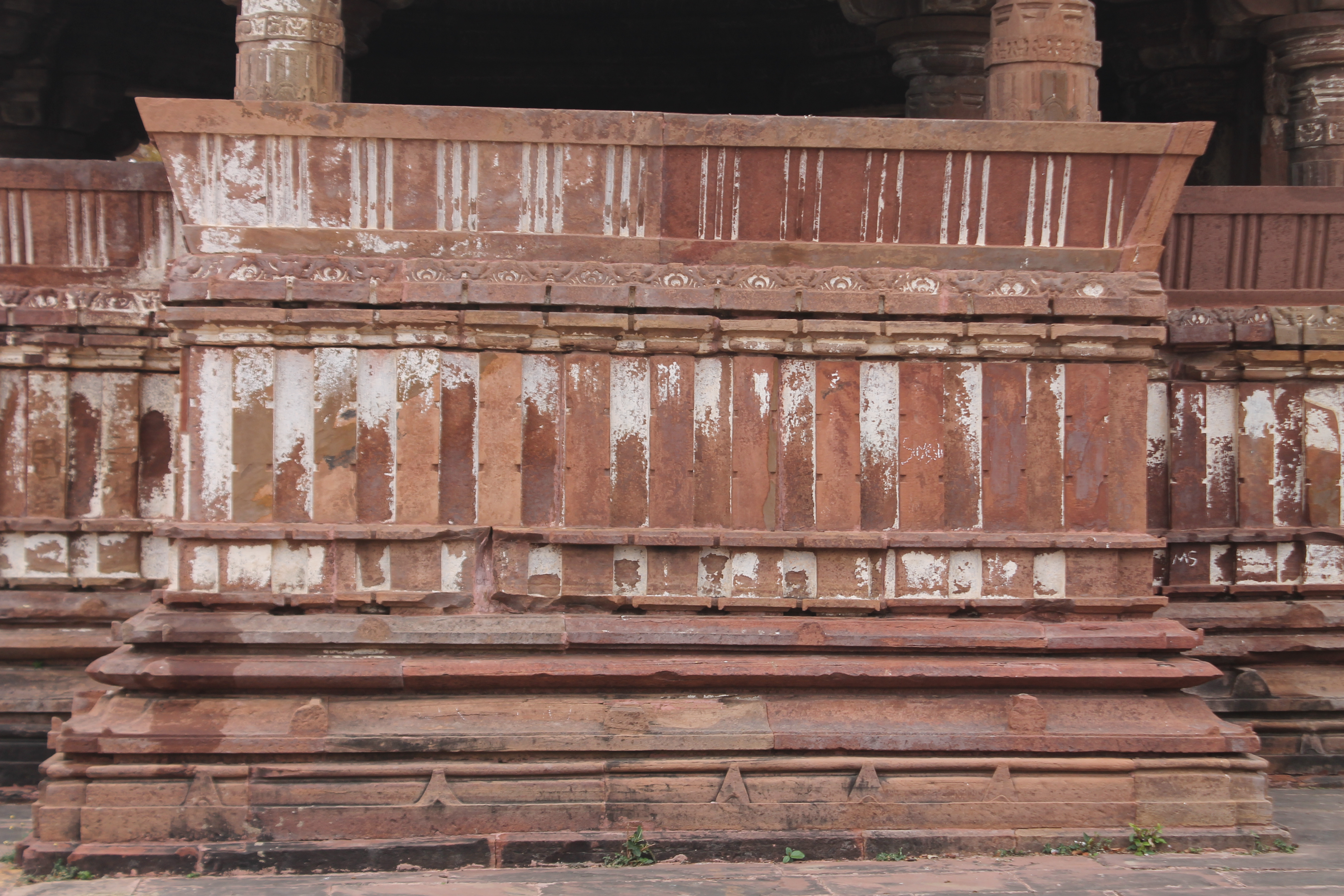 Pictured here is a view of the south elevation of the mandapa (pillared hall) of the Suhaveshwar Temple. The mandapa has two lateral transepts on the north and south sides. The exterior of the transepts has plinth mouldings that support a plain wall which is ornamented with pilaster motifs. The dwarf walls have slender and slanting kakshasana (seat backs) that have balustrade designs. Both the vedika (wall) and the slanting seat back of the kakshasana are bereft of ornamentation patterns.