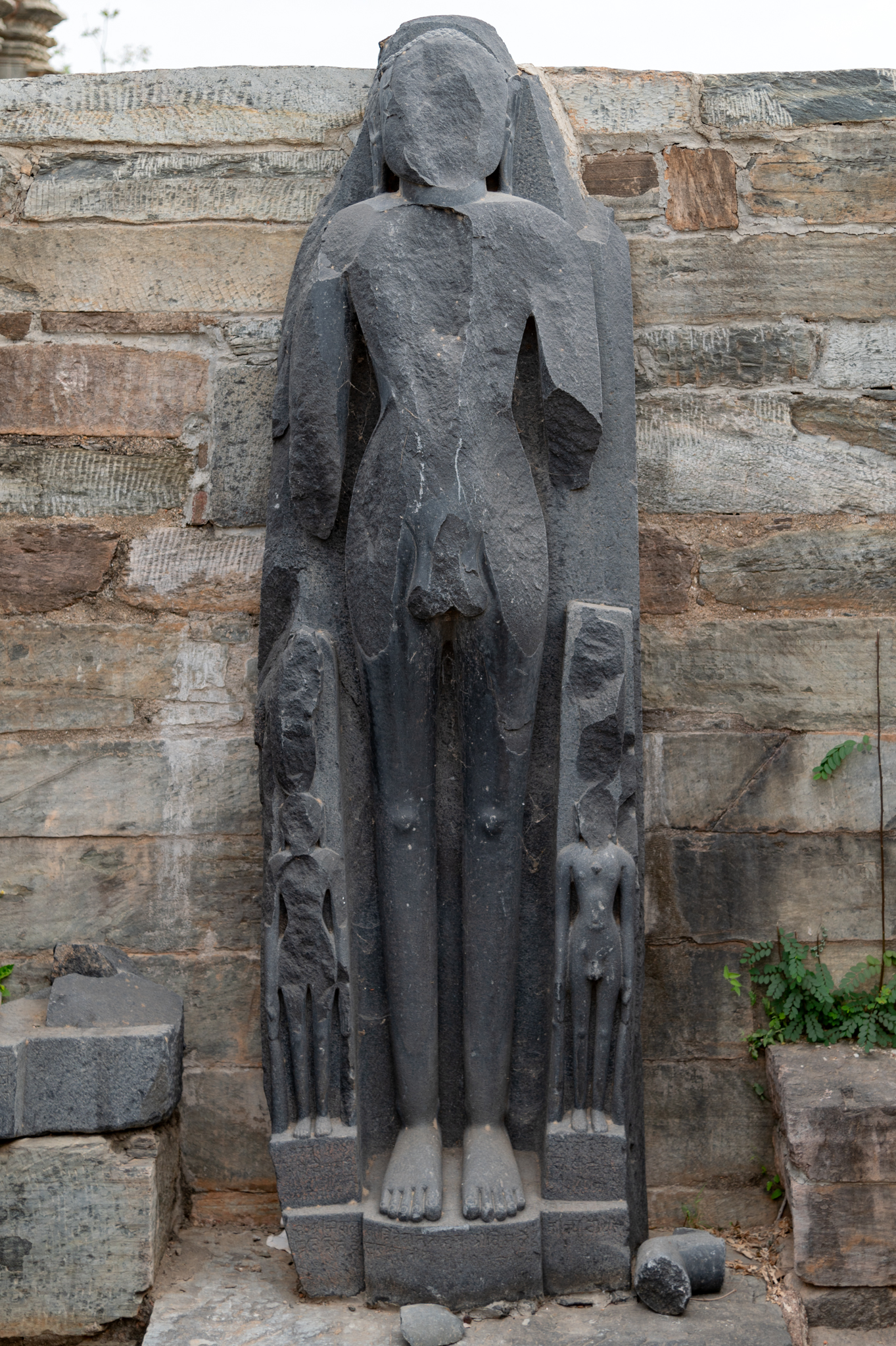 Seen here is a colossal sculpture of a Jain Tirthankara, standing in kayotsarga (dismissing the body) posture, found in the ruined shrine to the west of the central temple. The inscriptions at the base of the free-standing statues ascribe it to the 16th century CE. The sculpture is carved out of black stone, mostly granite variety.