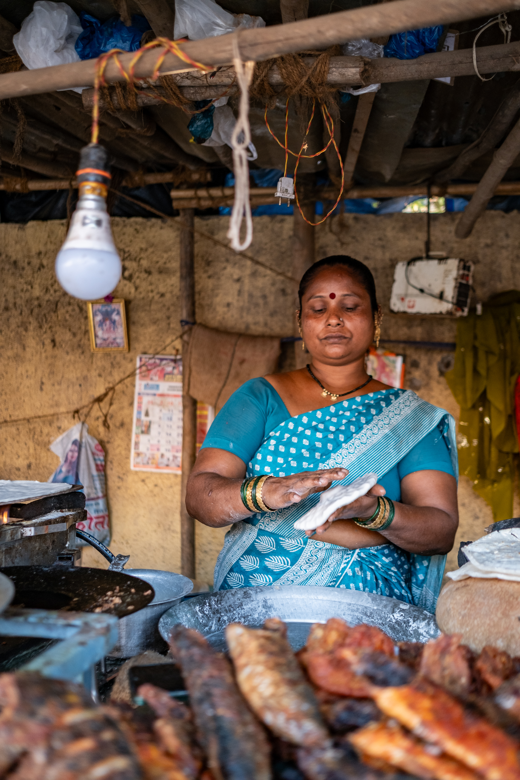 Once the dough is kneaded, it is divided into small, round portions. Each portion will be used to make an individual bhakri. Next, the dough is shaped into flat discs by turning it in a circular motion. Simultaneously, Urmila removes excess dough by pressing down on it with the palms of her hands.