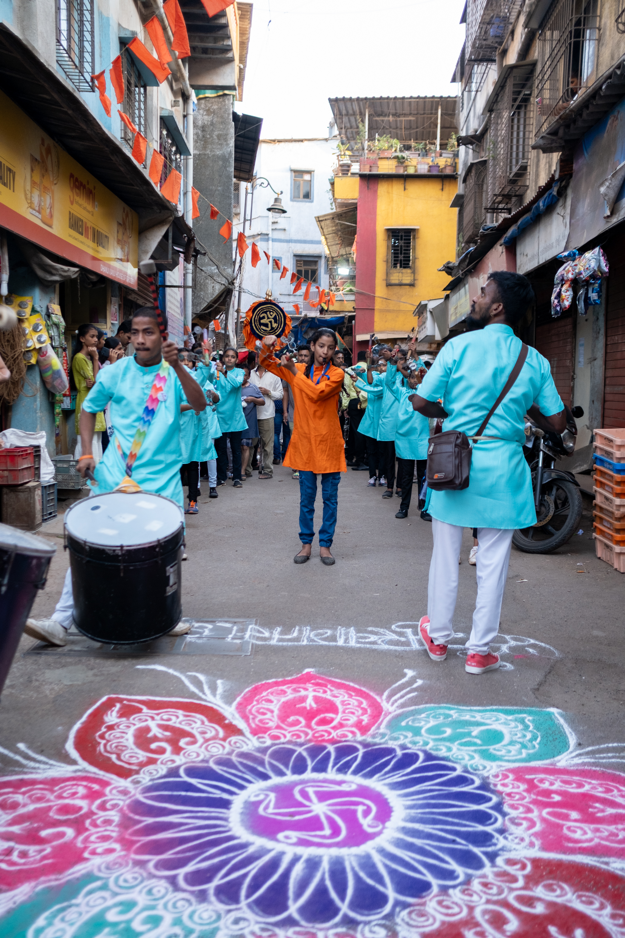 A troupe performs lezim, a Maharashtrian folk dance known for its energetic and rhythmic movements, including jumps, spins, and coordinated group formations. The dance is named after the lezim, a musical instrument made of wooden or metal rods with small metallic discs attached. When shaken, the discs produce rhythmic jingling sounds.