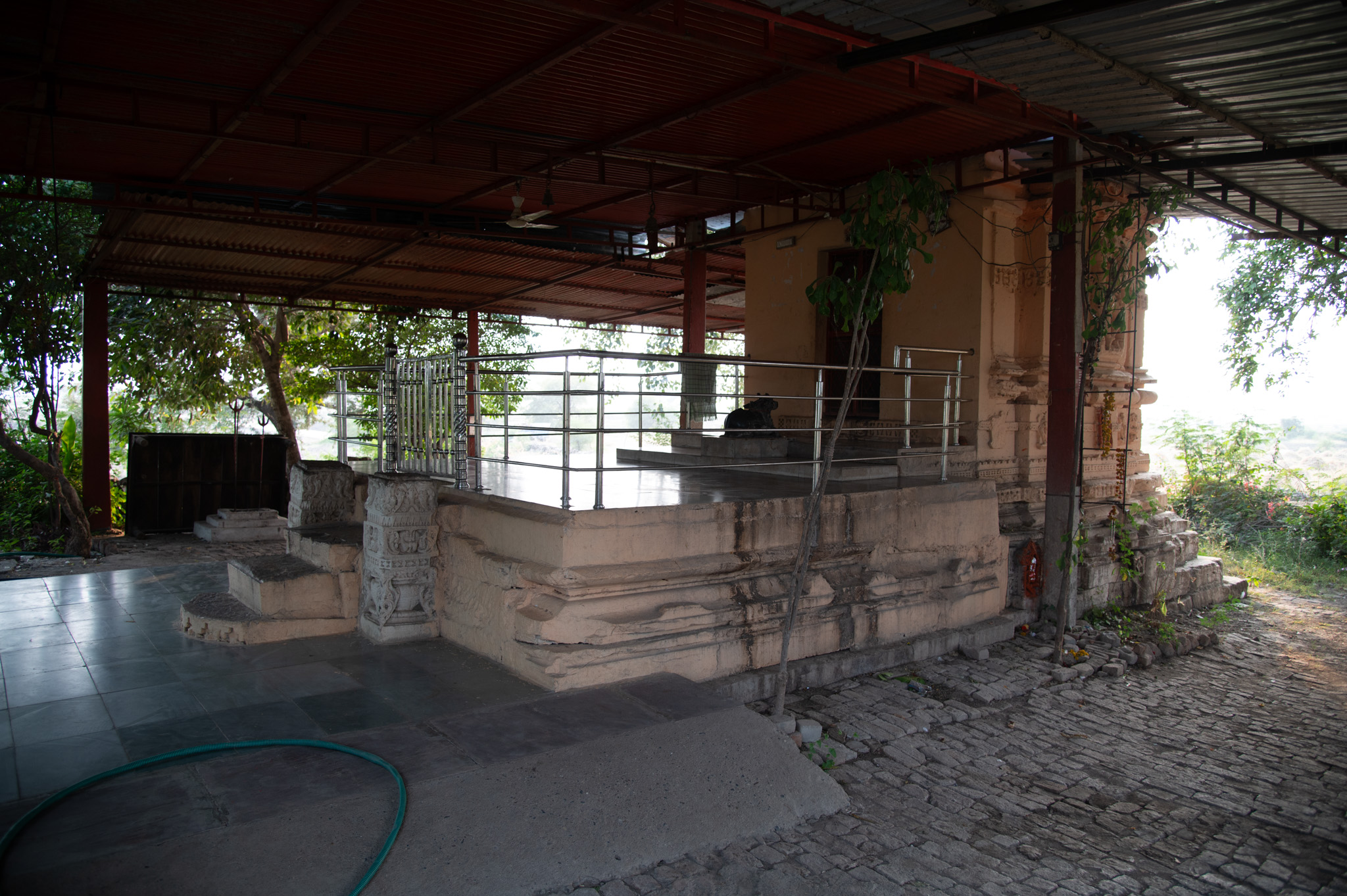 The surviving shrine, known as the Mahakal Temple, presently consists of an open mandapa with modern steel railing, situated in front of the original garbhagriha. The temple can be reached by flights of steps which are flanked by carved pillars. The base of the mandapa is old, evident from the old vedibandha, which is refloored with modern tiles. There is a nandi (the bull vehicle of Shiva) in the mandapa, facing the main sanctum.