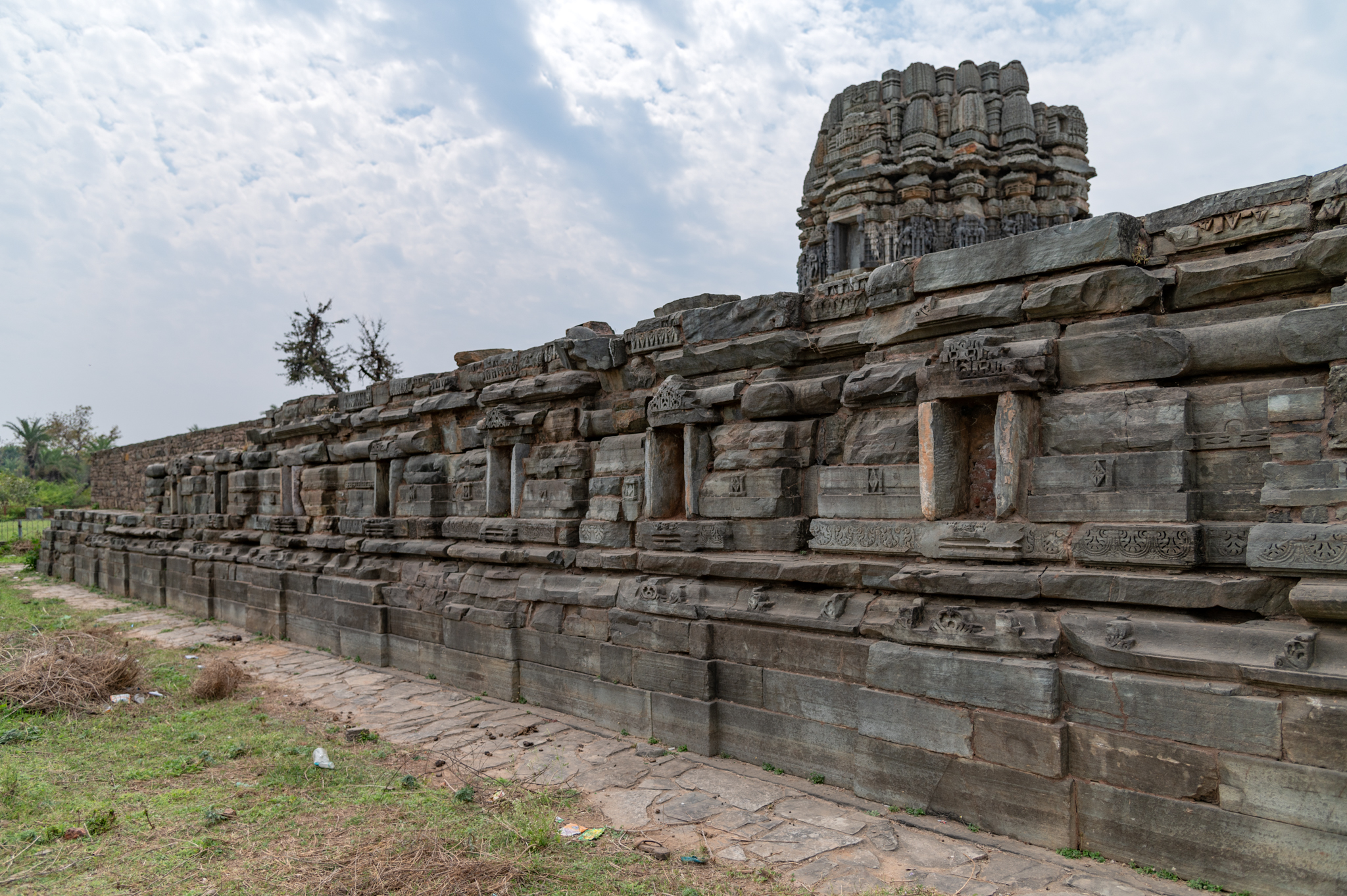 A closer view of the high plinth of the Chaunsath Yogini Temple is seen here. The plinth is composed of a pitha (base) on which are large kumbha (pot-shaped) wide projections, each having a devakoshtha (niche) on the surface. The mouldings of this plinth are similar to the mouldings of temple base plinth. A few plain bands are followed by a kapotali (cyma recta) moulding, kumbha, kalasha (a pitcher), and kani.