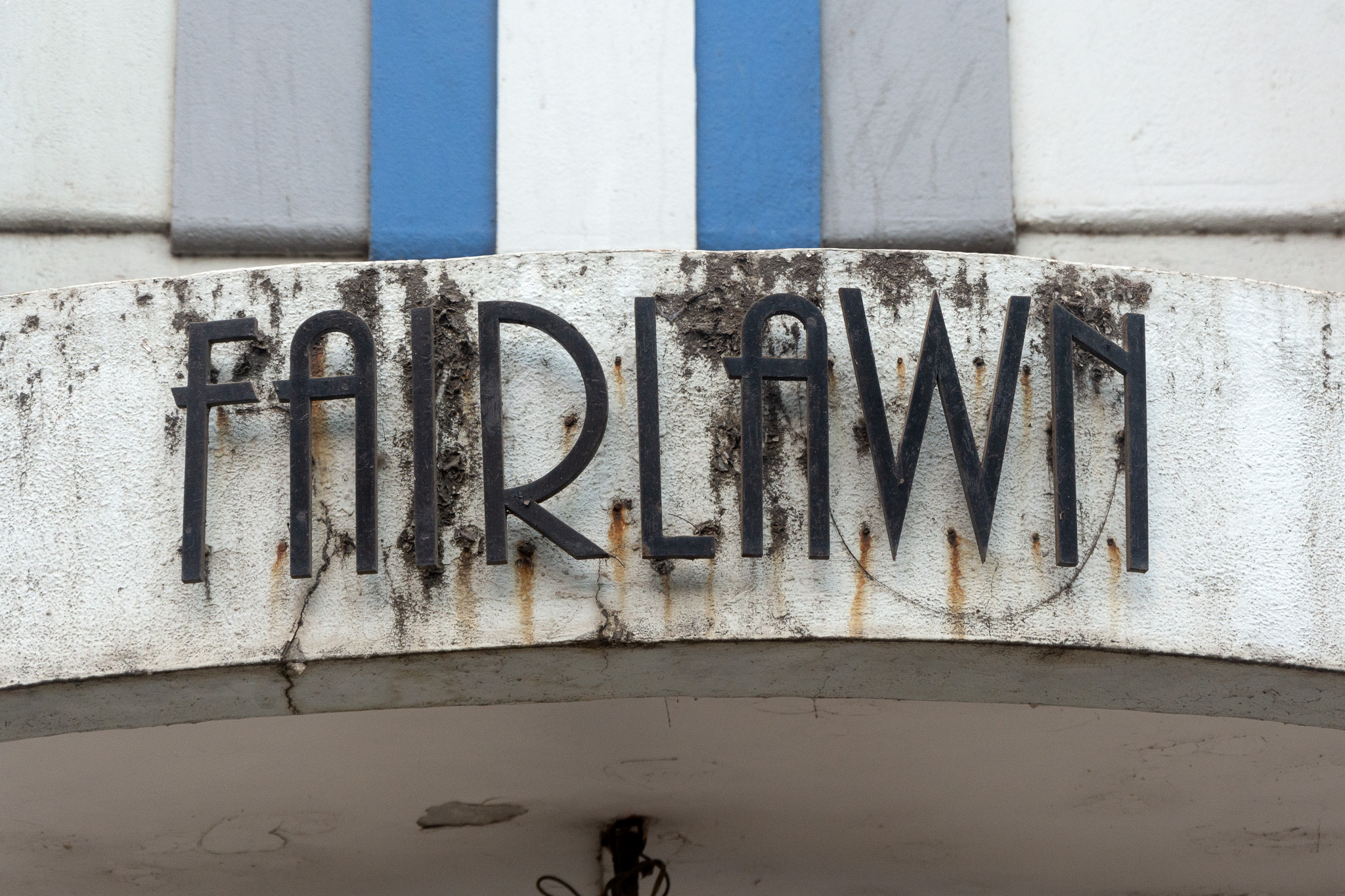 Metal cut out Avenida font used in lettering, Fairlawn.