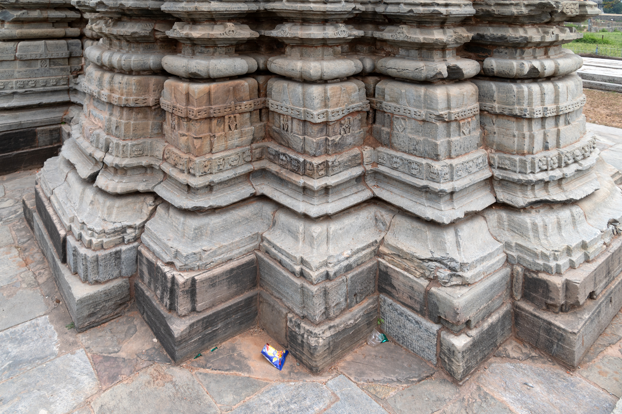 Closer view of the basal mouldings of the Jain Temple which show a plain moulding at the bottom followed by a curved moulding, a slender kani moulding, a band of kirtimukhas (face of glory) known as graaspatti, kumbha (pot-shaped) moulding, kalasha (a pitcher) moulding and finally two kapotali (cyma recta) mouldings. All these mouldings are beautifully crafted but do not have much surface ornamentation. The kumbha has a band of diamonds running all across the temple.