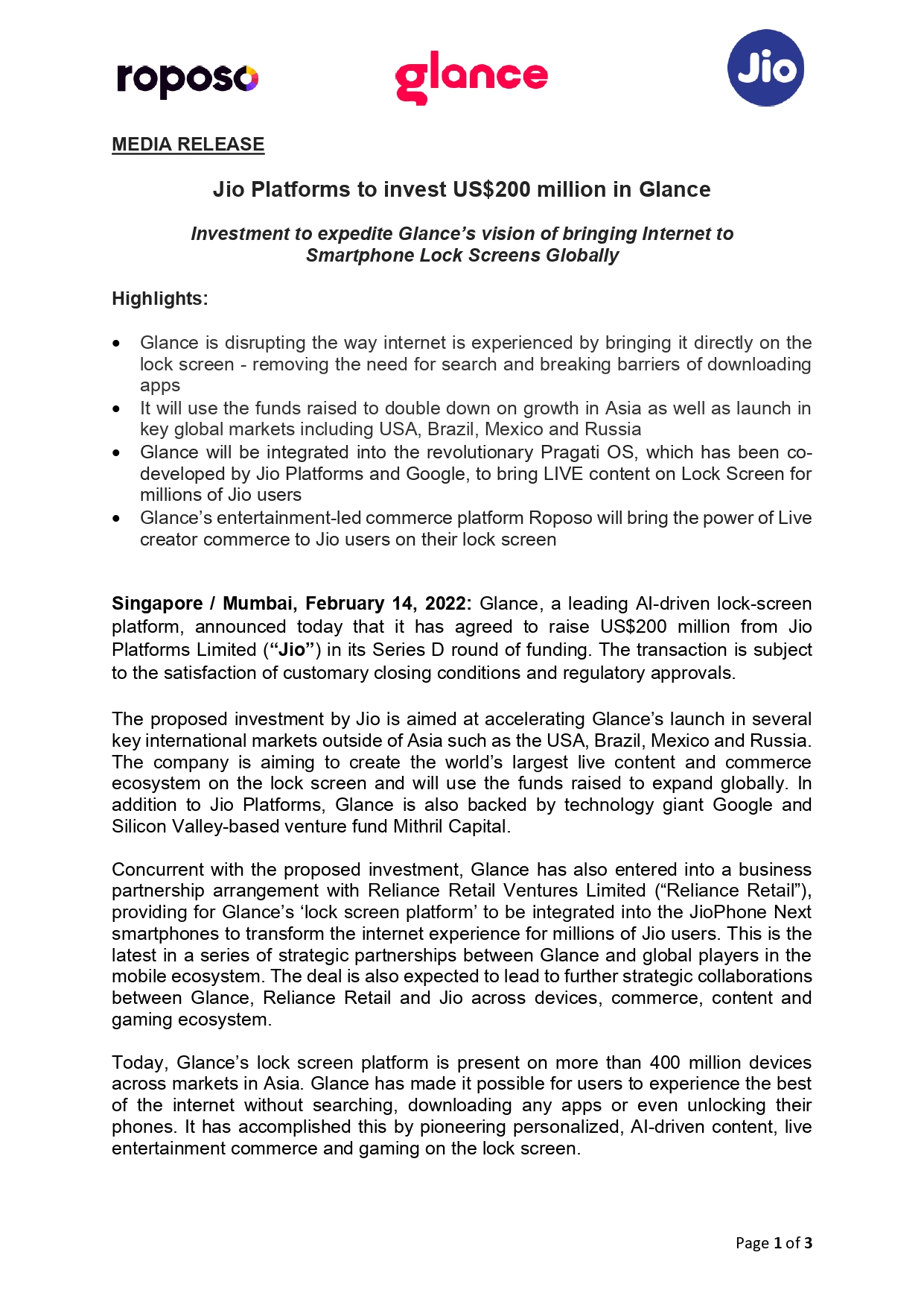 Jio_Platforms_to_invest_US200_million_in_Glance_page-0001.jpg | 17-08-2022 | Public |
