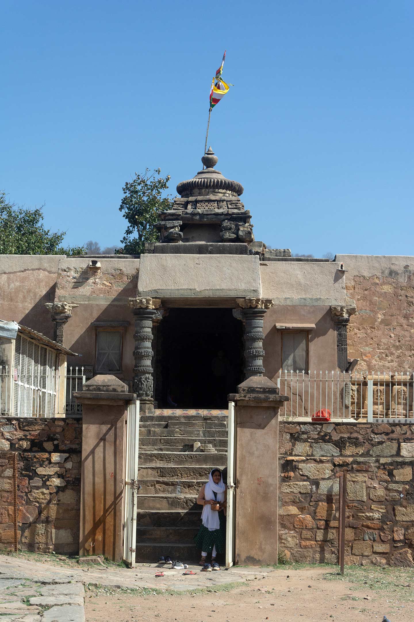The west-facing entrance of the Neelkanth Mahadev Temple is seen in the picture. The temple stands on a plinth. It is entered through a gate built into a later added boundary wall.