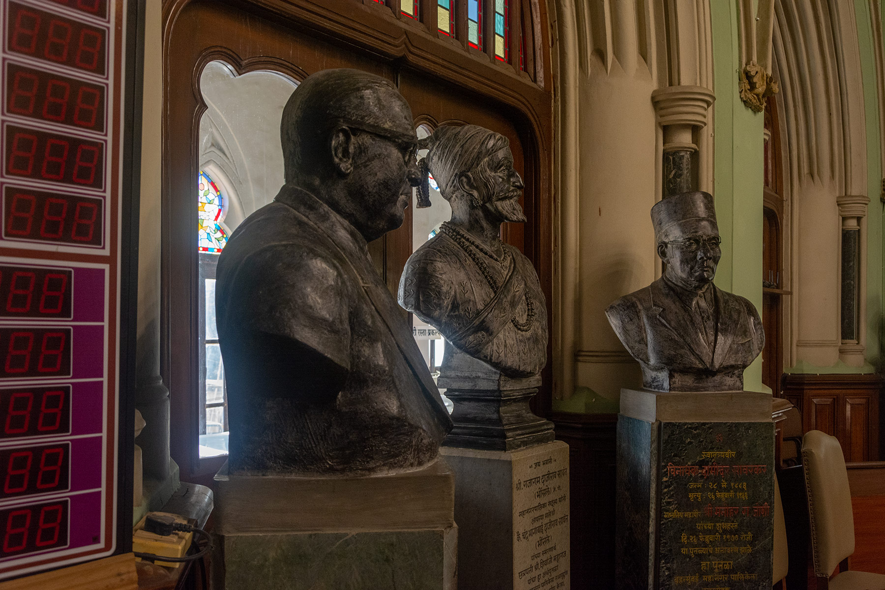The Corporation Hall has a collection of busts and statues of prominent personalities from Indian history, freedom fighters and eminent citizens of Mumbai who contributed greatly in the development of the city. Seen here are the busts of Dr B.R. Ambedkar, Chhatrapati Shivaji Maharaj and Vinayak Damodar Savarkar.
