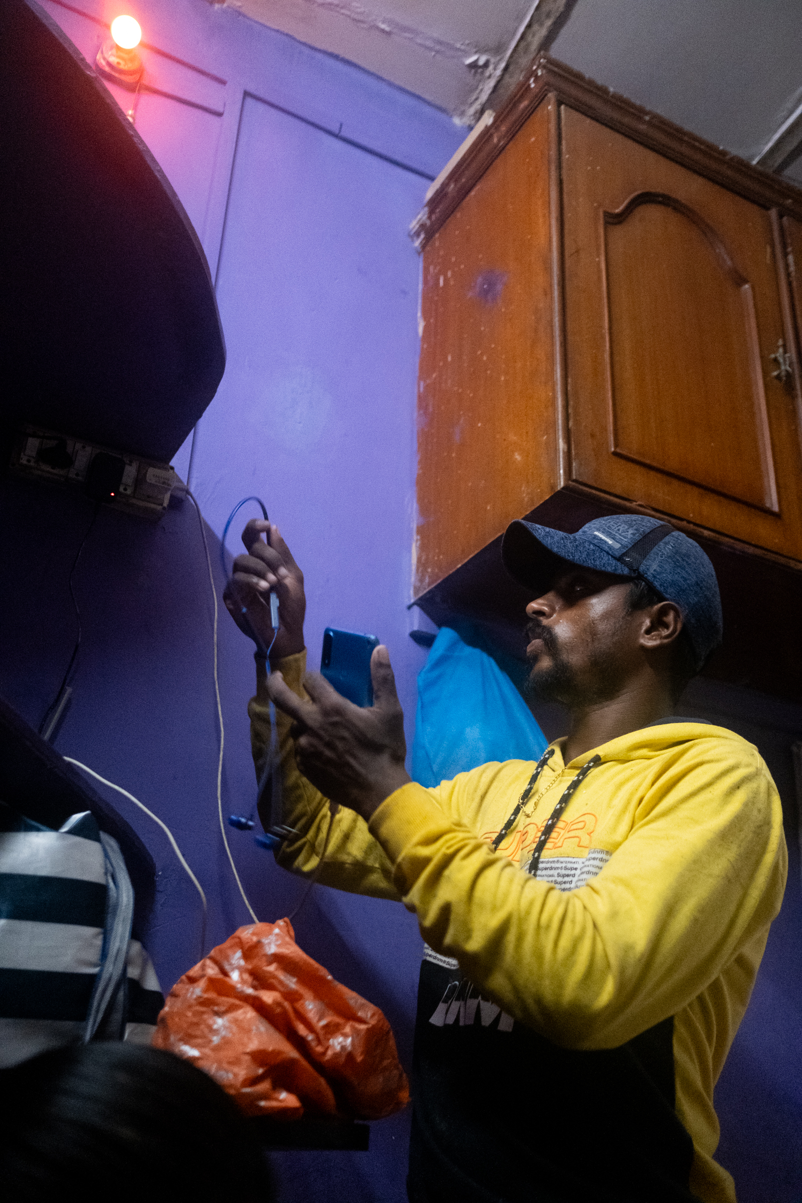 While his father prepares food for the family, Rahul Bhalia prepares for the next day’s venture. Phones are their only means of contact with the coast in case of sea danger, so Rahul ensures they are fully charged along with all other battery-operated equipment.
