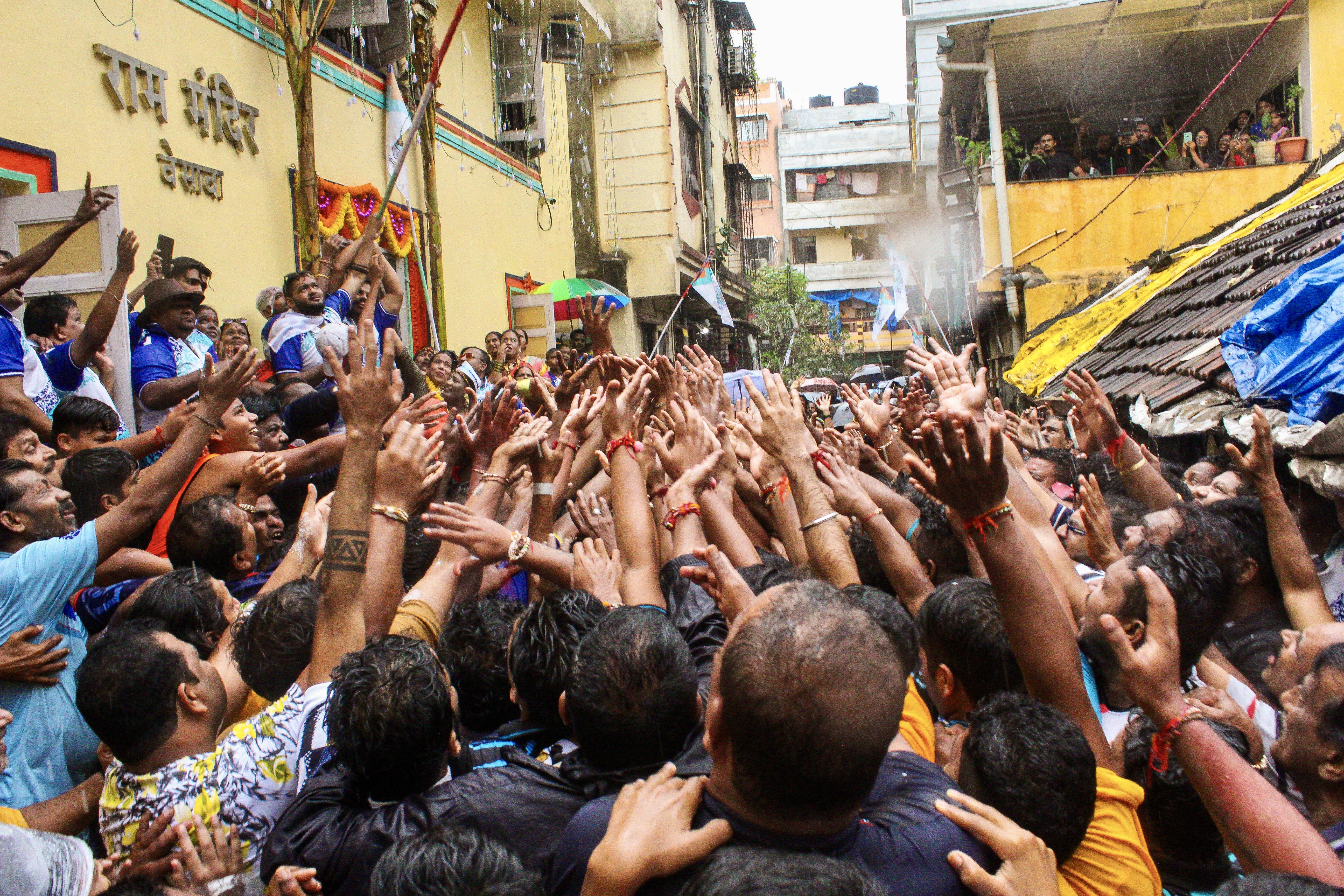 Large crowds assemble at the Ram Temple to participate in the Dahi Handi event. They jostle below the pot in anticipation of the shower of dahi (curd or yogurt).