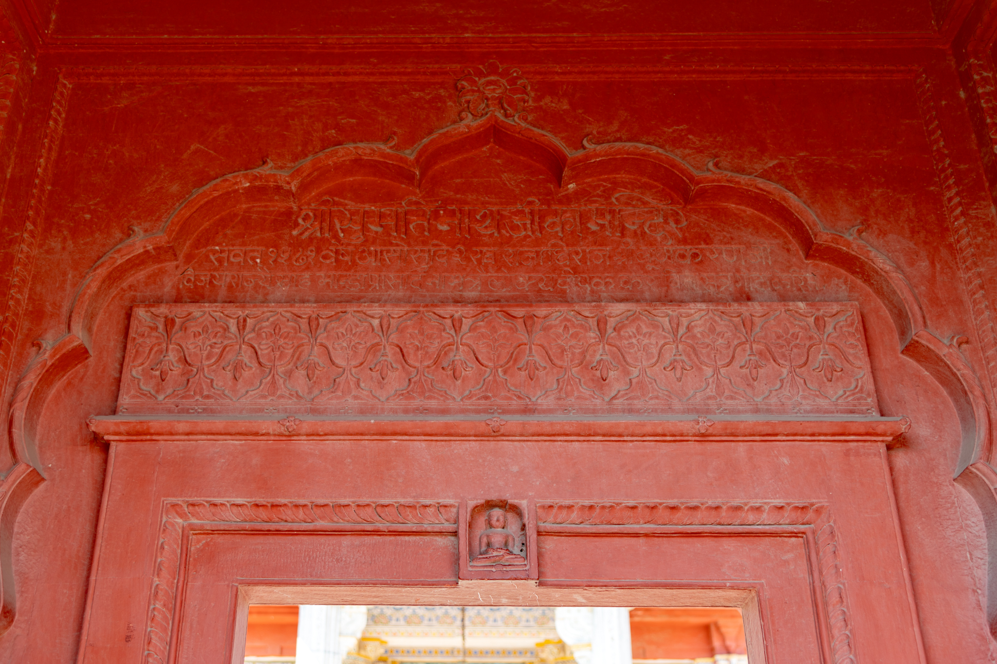 Close-up of the inscription on the entrance gate, above the lintel. The inscription states that in 1464/1514 CE (VS 1521/71) the Bhandaprasada was built during the reign of Rao Lunkaran. The date is not clear. The inscription is copied here from the inscription in the antarala (antechamber) of the temple.
