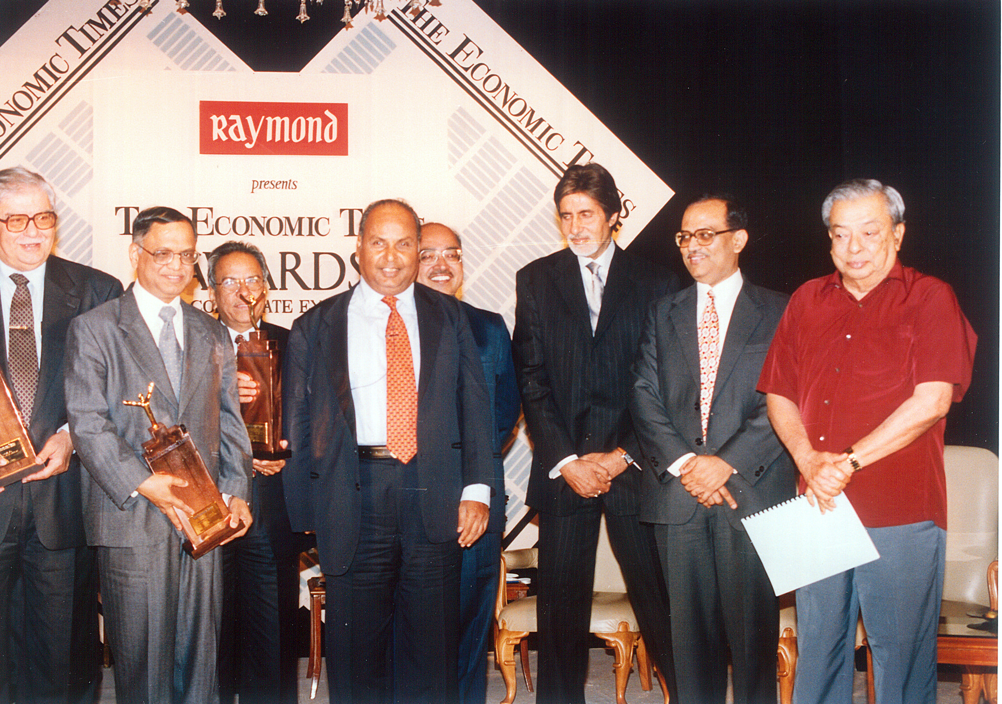 First among equals (from left to right): J J Irani, MD,Tata Steel, NR Narayana Murthy, Co-founder and Chairman, Infosys, NS Raghavan, Infosys, Dhirubhai Ambani, Reliance, Amitabh Bachchan, actor, Srinath Batni, Infosys, Dr Verghese Kurien, Founder-Chairman, National Dairy Development Board Image Courtesy: Reliance Industries Limited.