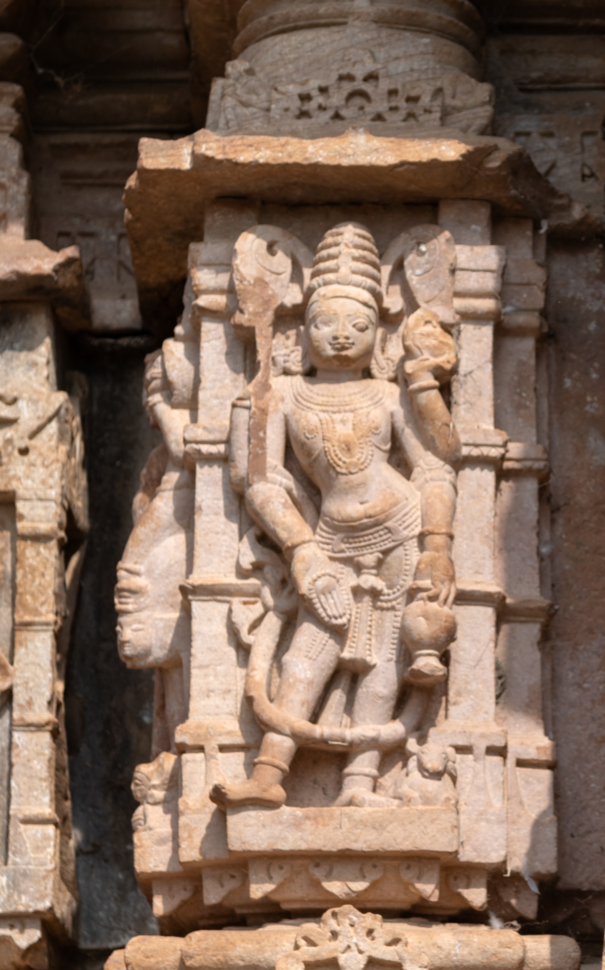 Yama, the guardian of the southern realm, stands with an air of solemnity and grace. Despite the loss of his upper right hand, which once held the danda (rod of justice), his presence remains commanding. In his upper left hand, he holds a rooster. His lower left hand holds a kamandalu (water pot), and his lower right-hand holds a rosary and makes a varada hasta (boon-giving gesture). Crowned and adorned with jewels, Yama is accompanied by his mount, the buffalo.