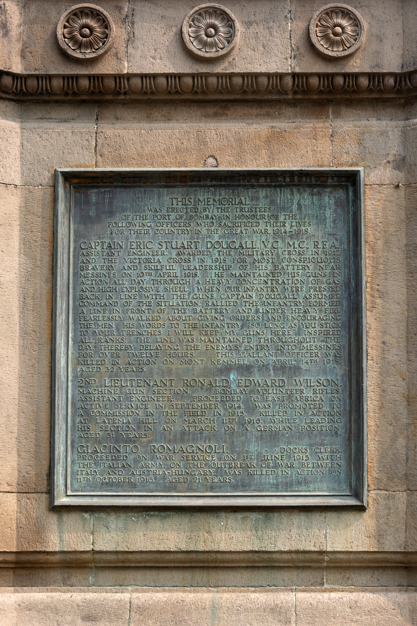 Commemorative plaques were erected by the trustees of Bombay Port Trust in honor of officers who sacrificed their lives in WWI. The names include Captain Eric Stuart Dougall (died 14th April 1918), 2nd Lieutenant Ronald Edward Wilson (died 11th March 1916), and Giacinto Romagnoli (died 11th October 1916). Dougall was awarded the Victoria Cross for his deeds on 10 April 1918 at Messines, Belgium. Prior to his war service, Dougall was an Assistant Engineer at Bombay Port Trust.