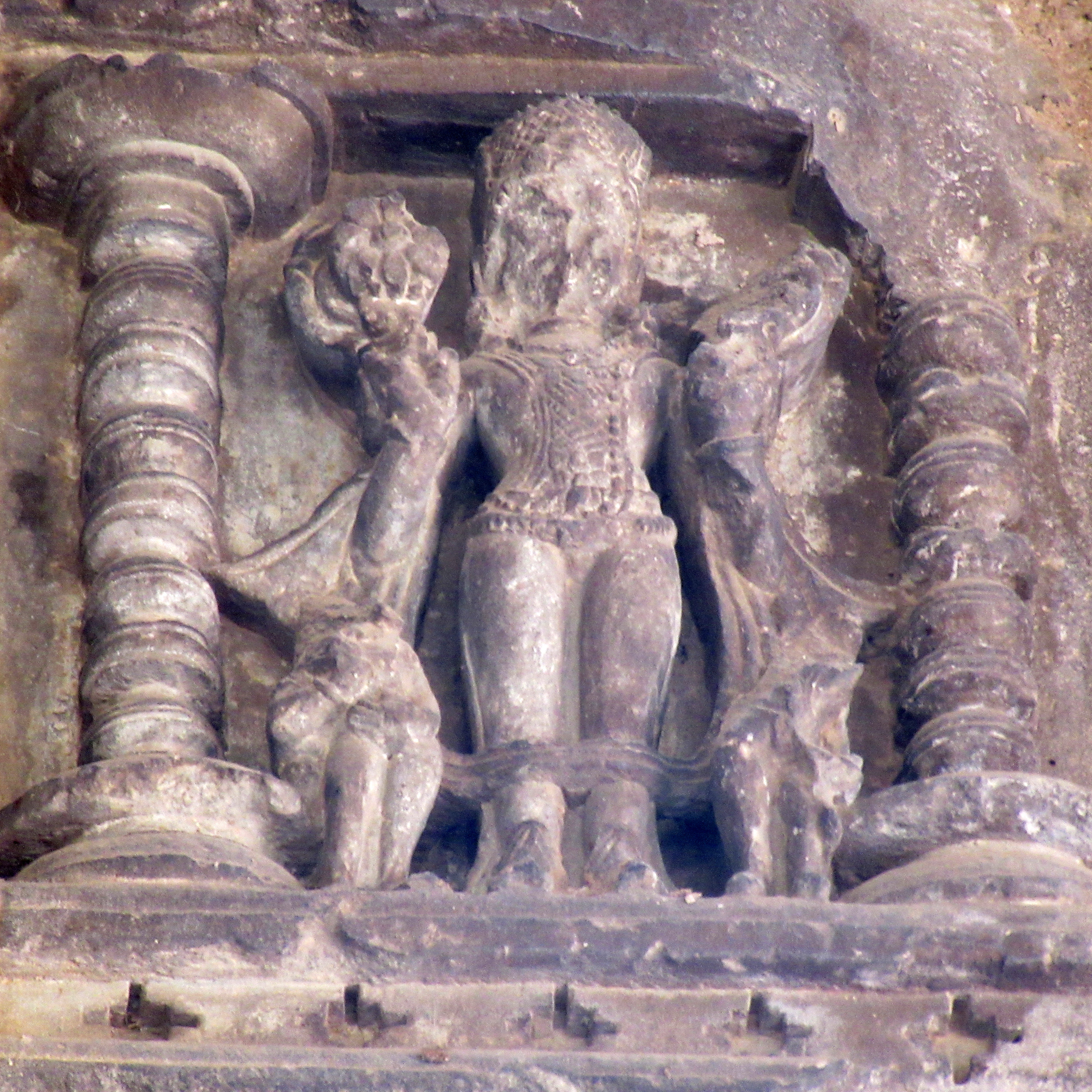 Standing male deity in the samabhanga pose adorned with a mukuta (headgear), meshed armour, uttariya (stole or scarf-like garment) and boots. He holds lotuses in full bloom in both hands. Broken figures of Danda and Pingala are present on either side of the legs.
