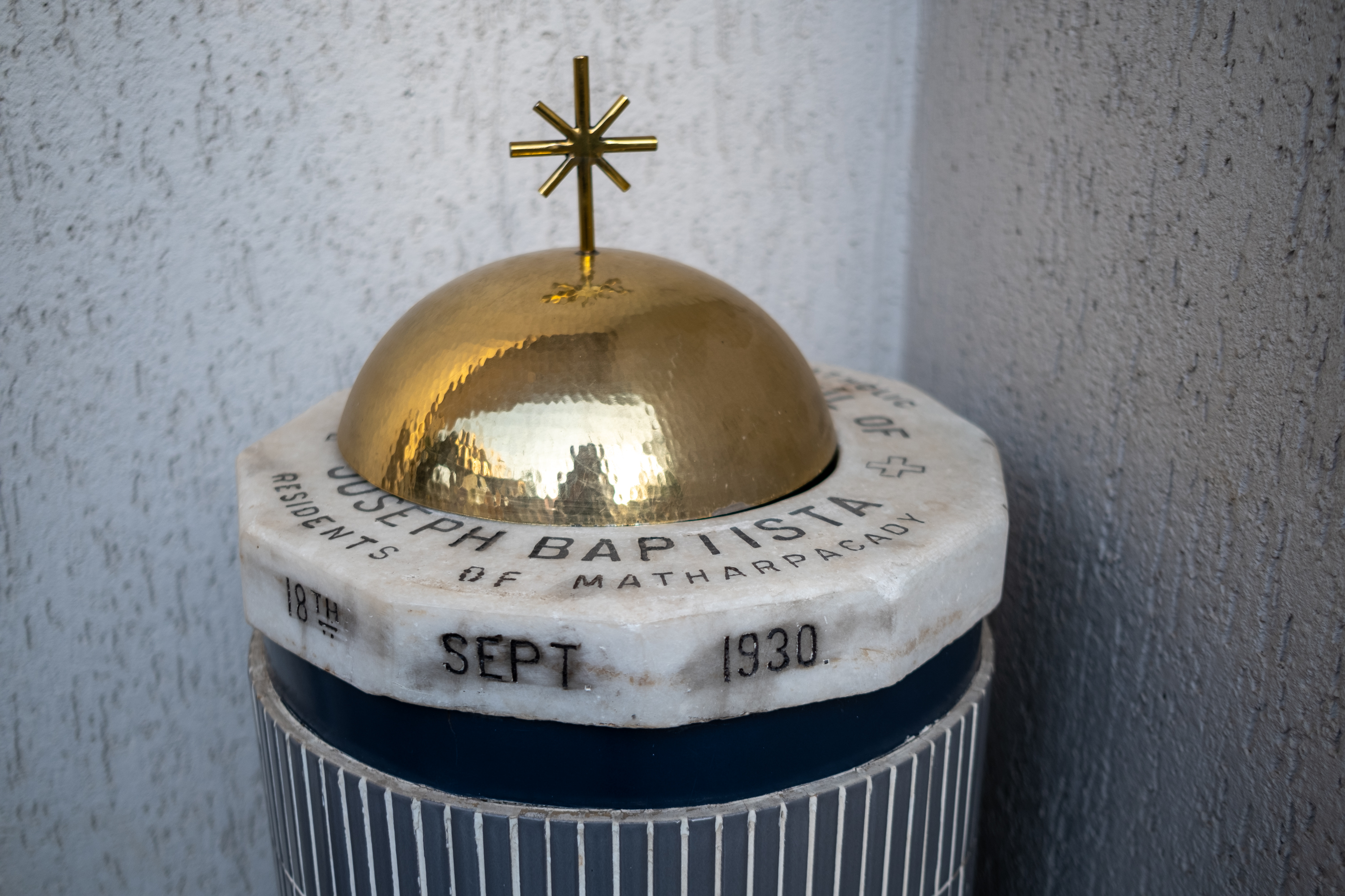 The baptismal well at Our Lady of the Rosary is dedicated to Joseph Baptista, who was born in Matharpacady on January 4, 1864. Baptista was a fervent nationalist who studied law to become a barrister. As a member of the Indian National Congress (INC), he significantly contributed to the mobilization of public opinion in support of Indian Home Rule through his writings, speeches, and political engagement.