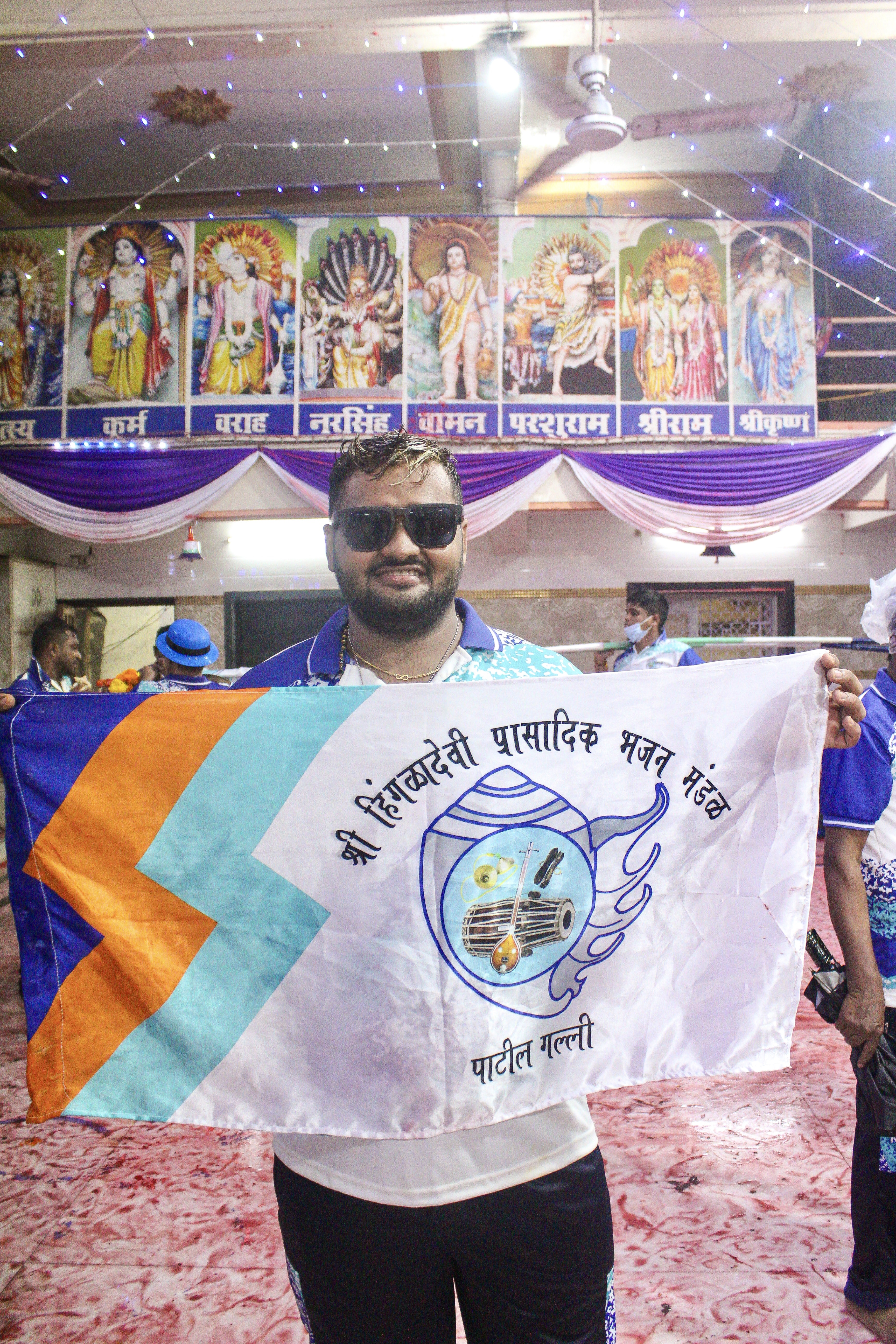 A band member is holding a banner of Sri Hinglay Devi Prasadhik Bhajan Mandal. Sri Krishna's divine exploits are praised through the singing of devotional bhajans and kirtans.