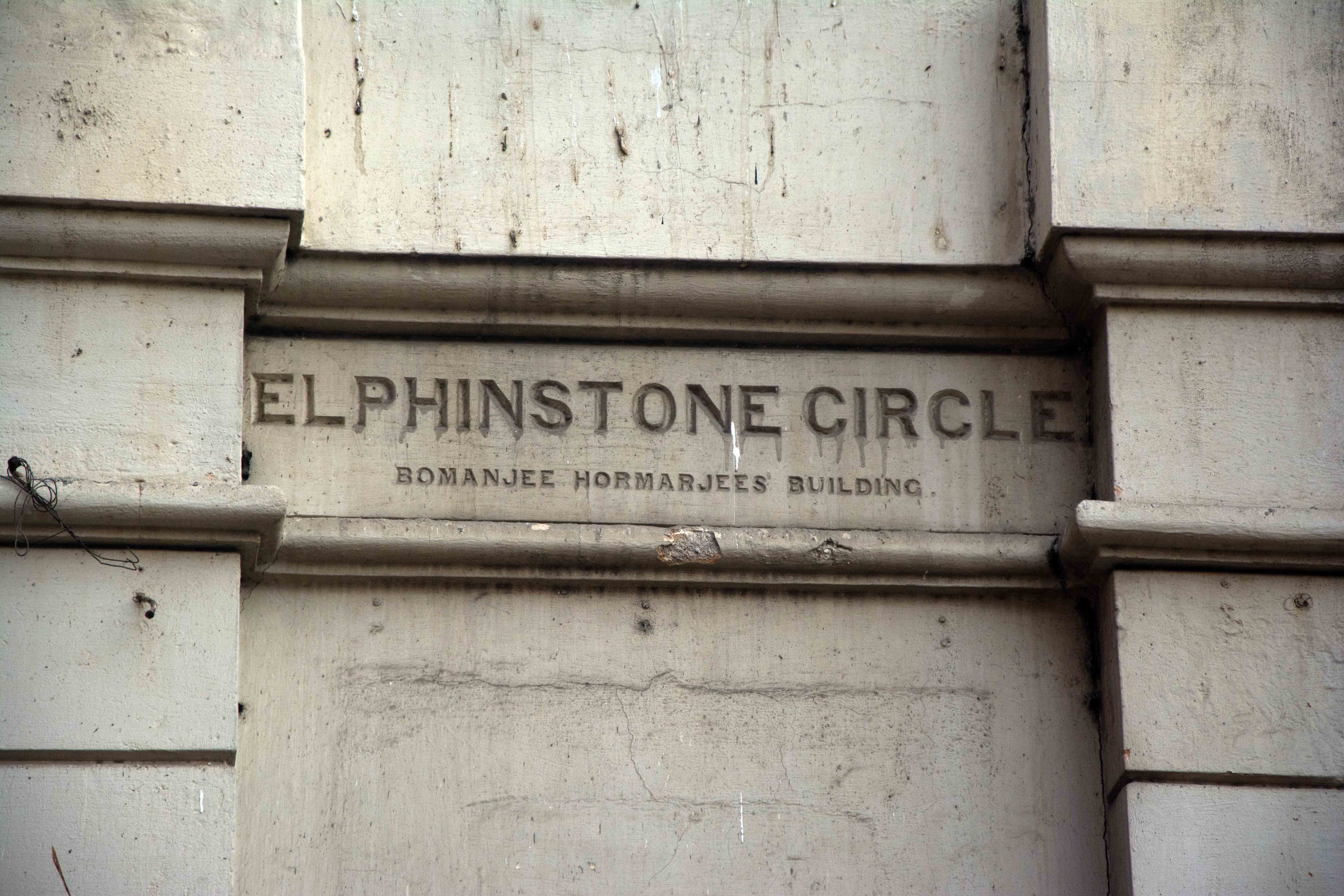 The old name of Horniman Circle on the Bomanjee Hormarjees Building. The Parsi after whom the building is named, Bomanjee Hormarjees Wadia (d. 1862) was a member of the Bombay Native Education Society and served on the board of Elphinstone Institution. His house was a popular meeting place to exchange gossip, and thus earned the epithet 'Gup House'.