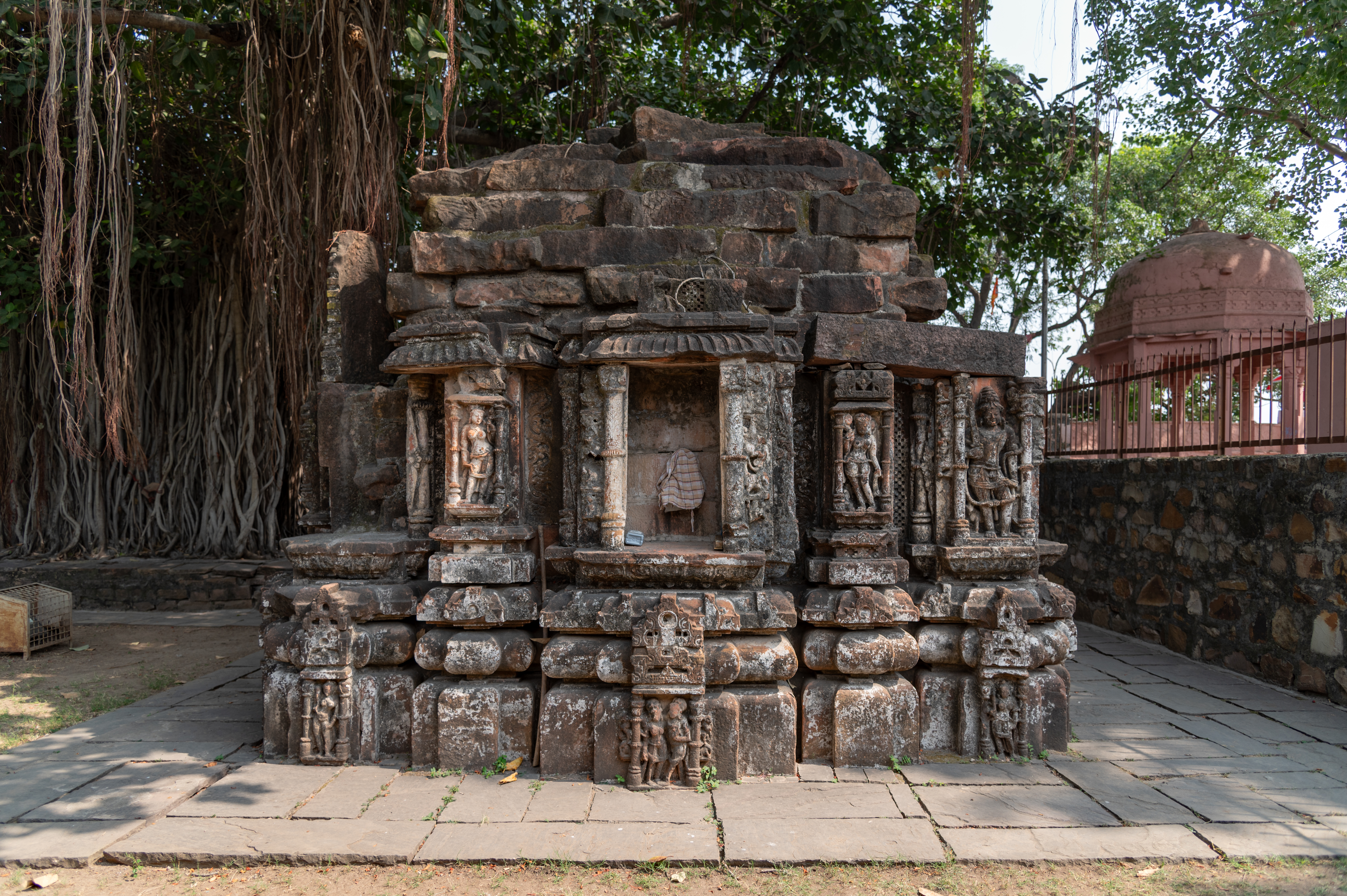 At the rear of Shiva Temple 1, depictions of surasundaris (celestial damsels) adorn the walls of the garbhagriha (sanctum sanctorum). They are presented standing gracefully, holding a flower stalk in one hand and grasping the edge of the scarf with the other. The rhythmic composition is achieved through the flexed postures, flowing scarves, and curved flower stalks.
