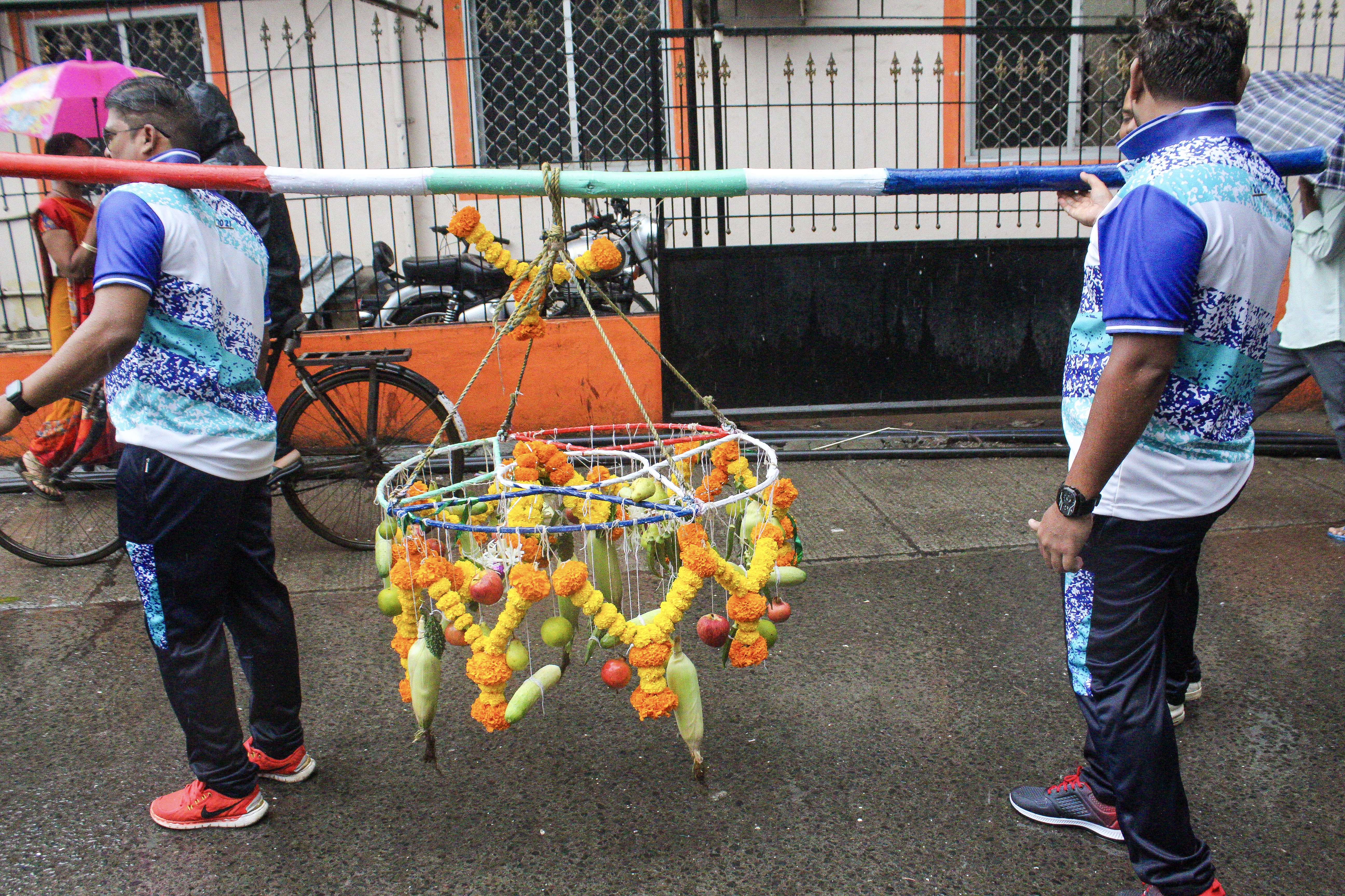 A circular frame is designed to hold the pot, decorated with floral garlands and mango leaves. Fruits and vegetables donated by villagers are also part of the decor. These would be distributed as prasada after the event.
