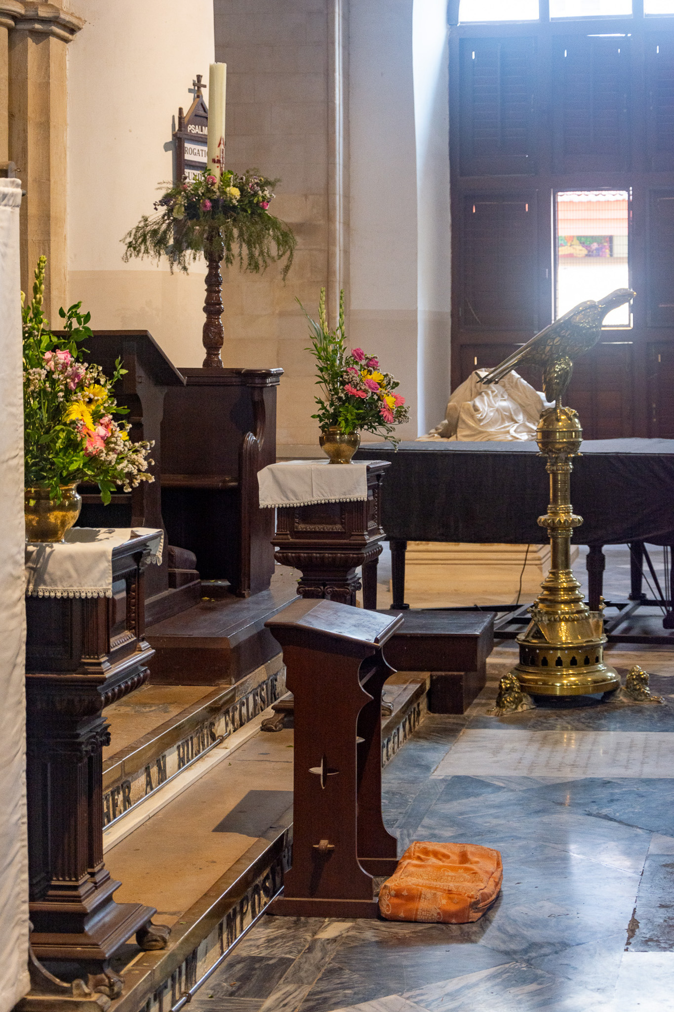 Kneeler at the St. Thomas Church altar. A kneeler is a cushion (a tuffet or hassock) used for resting the knees in a kneeling position during Christian prayer. Seen in the background are the brass eagle lectern and the grand piano.
