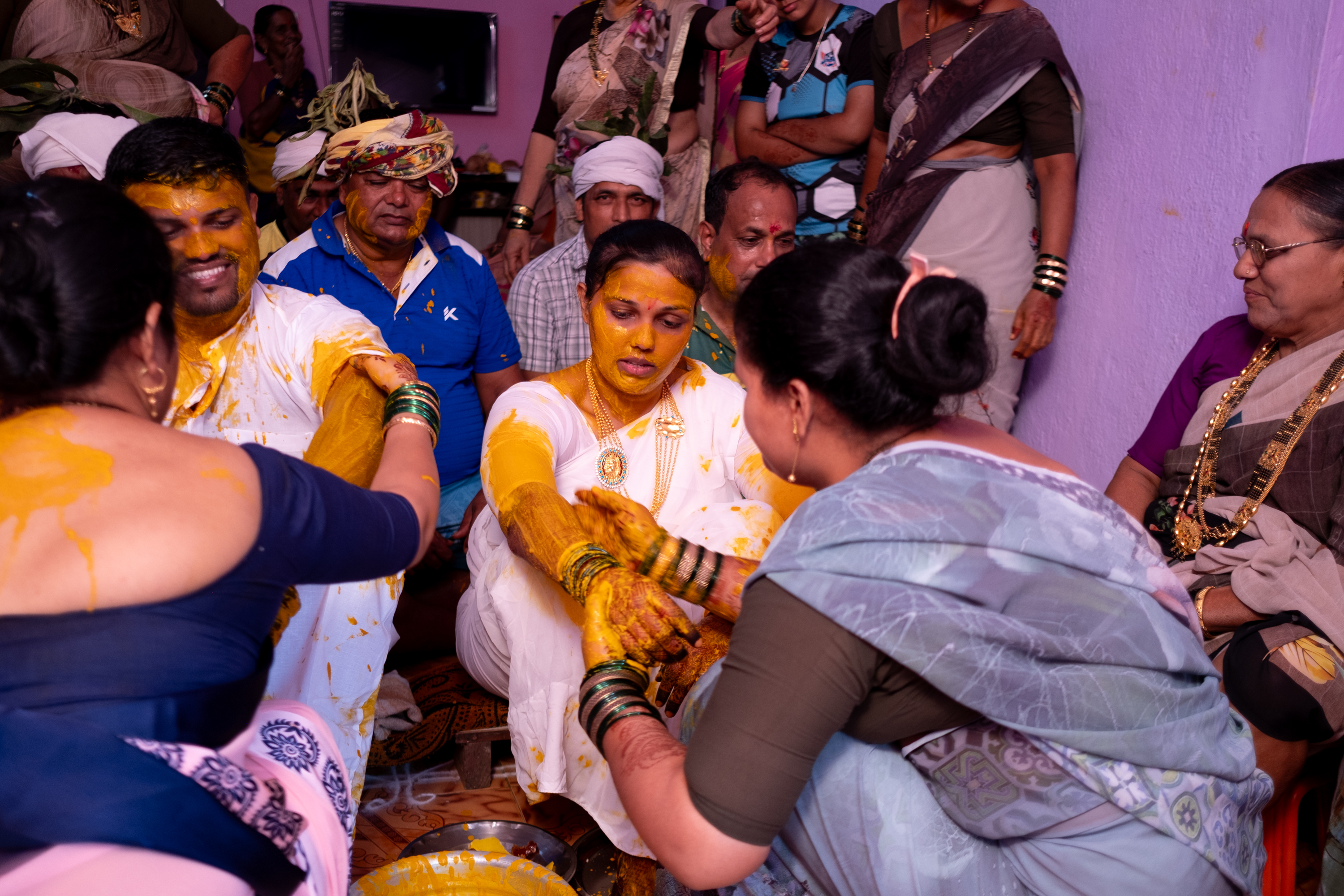 During the haldi (turmeric) ceremony, a paste made from turmeric, sandalwood, and other ingredients is applied to the bride and groom. This application is done either by hand or using mango leaves, starting typically from the feet and moving upwards to the arms and face.