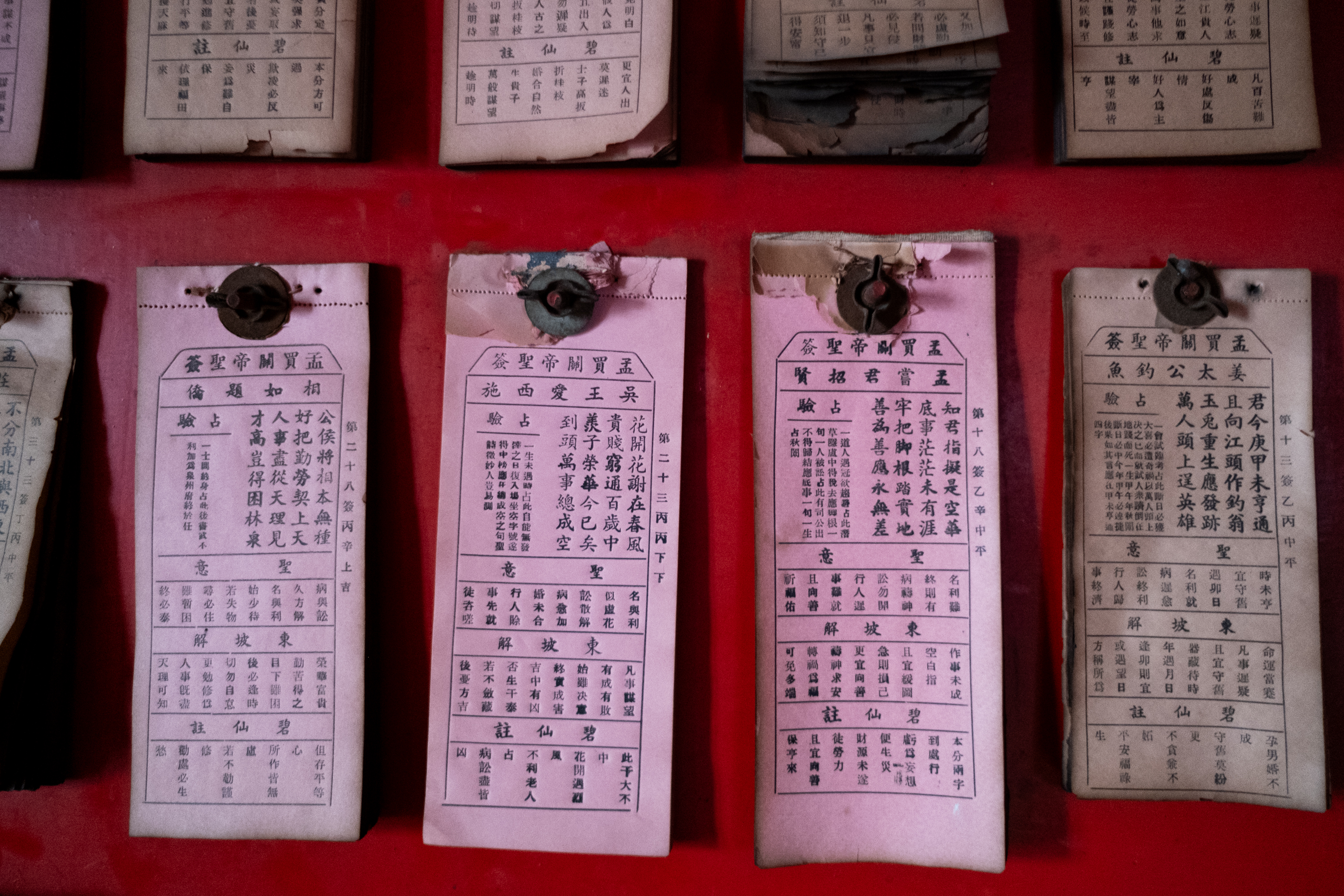 Fortune Sticks, known as Kau Cim, are bamboo sticks inscribed with numbers. These sticks are shaken out of a container to reveal fortunes, with each number corresponding to a written fortune that can be interpreted by temple staff. Kau Cim is often performed in temples dedicated to popular deities such as Guanyin (Goddess of Mercy), Guan Yu (God of War), and Mazu (Goddess of the Sea).