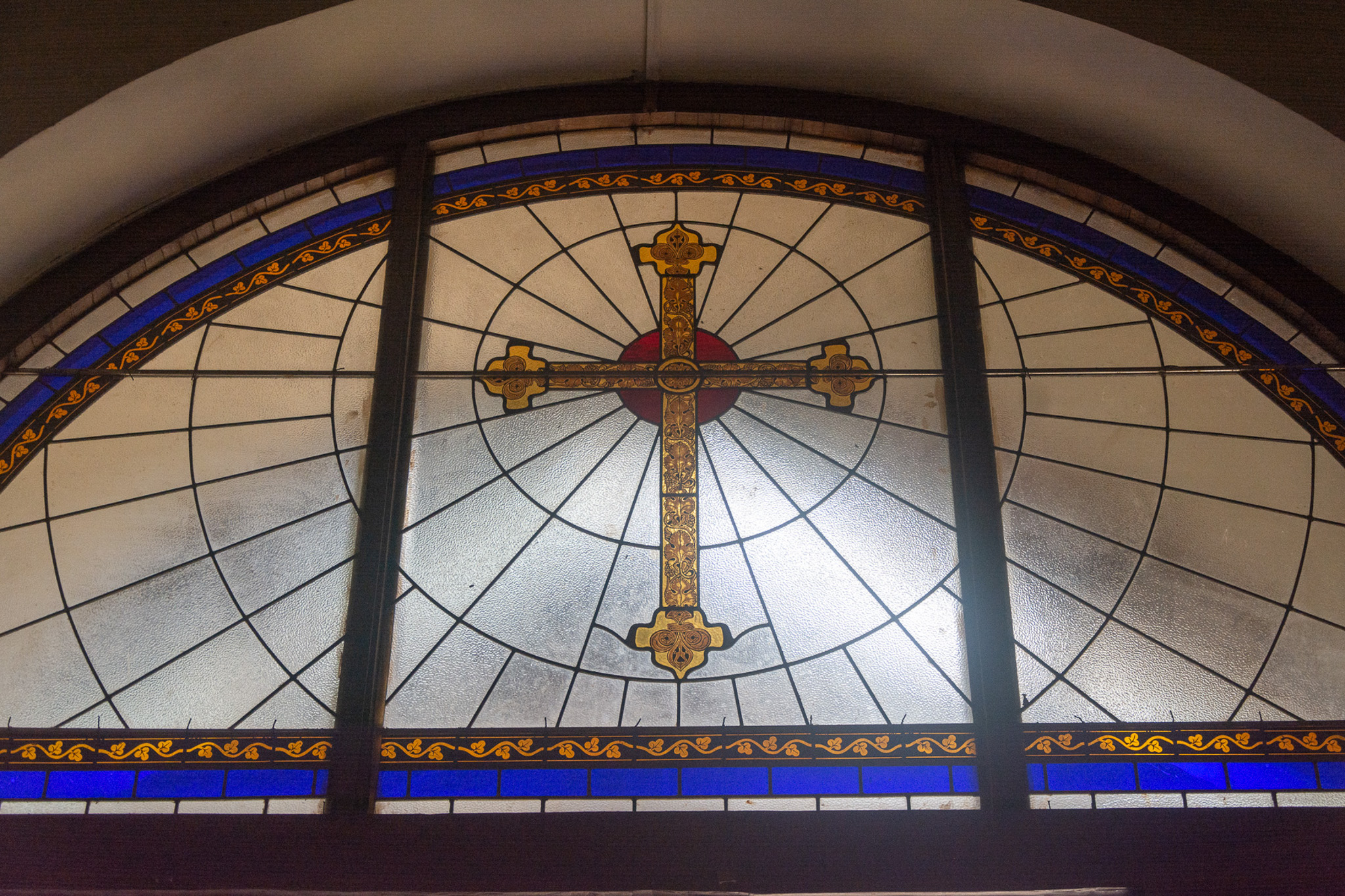 Stained glass works on the fanlight with a golden cross. A foliage motif paired with a blue band runs around the border. A fanlight is a semicircular or semi-elliptical-shaped window with glazing bars or tracery sets radiating like an open fan, hence its name. This fanlight is placed above the door on the entrance (west) to St. Thomas Church.