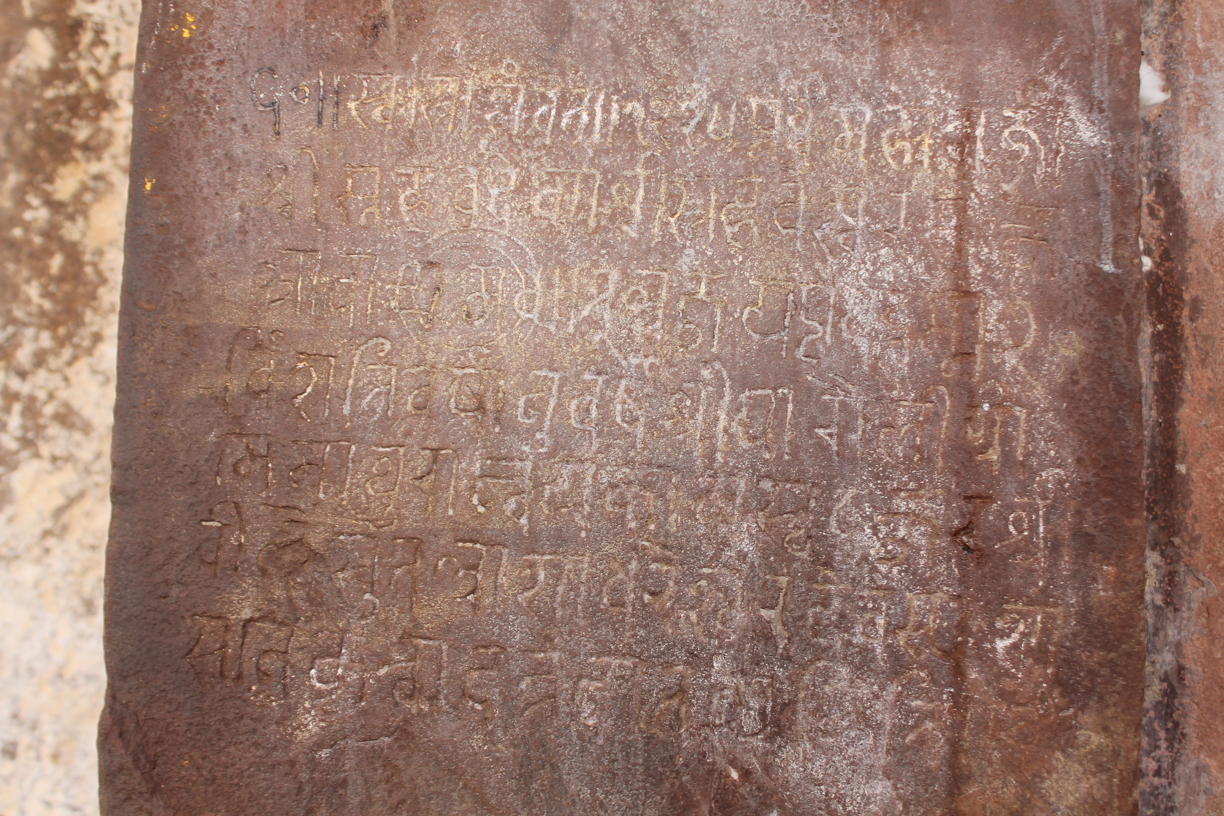 Seen here is an inscription on the pilaster on the right side of the antarala (vestibule or antechamber) in the Suhaveshwar Temple. The inscription is written in Sanskrit language using Devanagari script. The inscriptions state that Suhavadevi, queen of Prithviraja II, the Chahamana King in the year 1168 CE, gave donations for the construction of the temple.