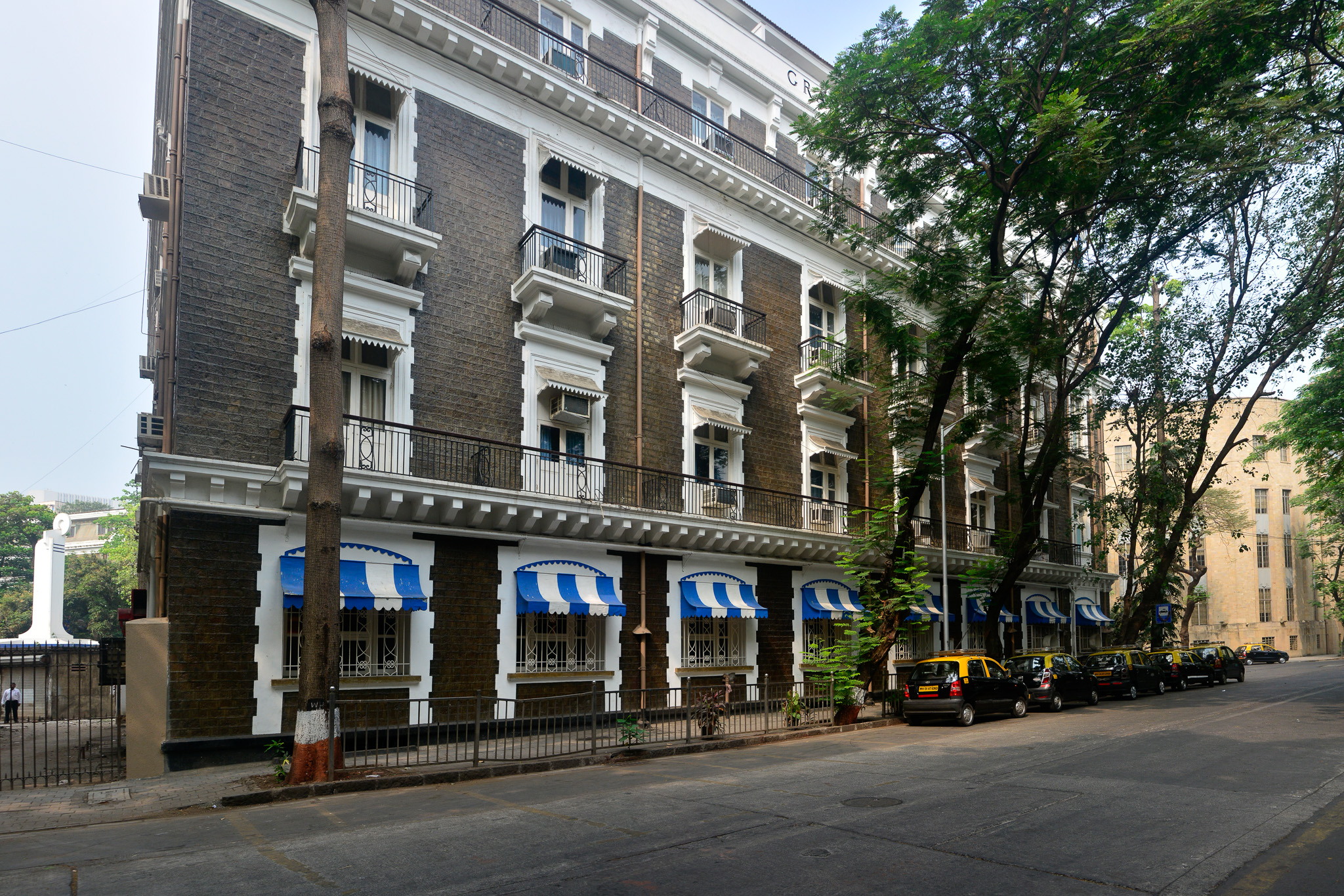 The Grand Hotel has ground-level windows with outward projecting canopies painted in alternating bands of blue and white. Above the windows, bracketed cornice runs all around the building, supporting balconies on the first floor (also on the third-floor level). The second-floor balconies are supported by stone brackets.