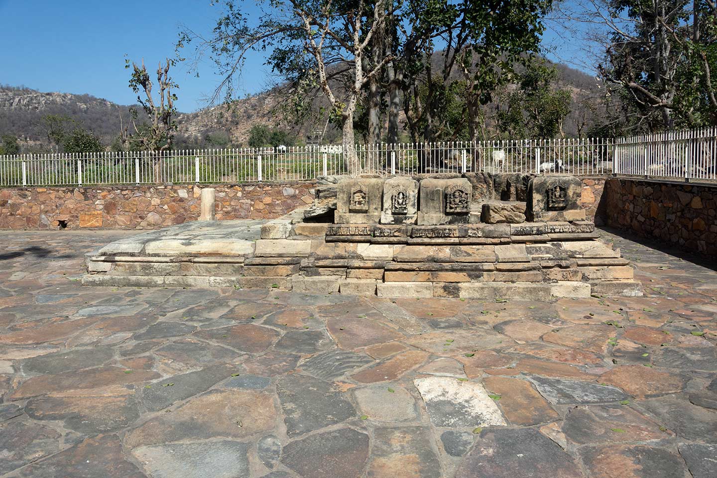 This is the ancillary shrine to the northeast of the main Neelkanth Mahadev Temple. It is a single-shrine temple in a very dilapidated state. Only a few mouldings of its plinth have survived. The temple was originally pancharatha (five vertical offset or projections on each side) in its plan, but the structure of the mandapa (pillared hall) has fallen.