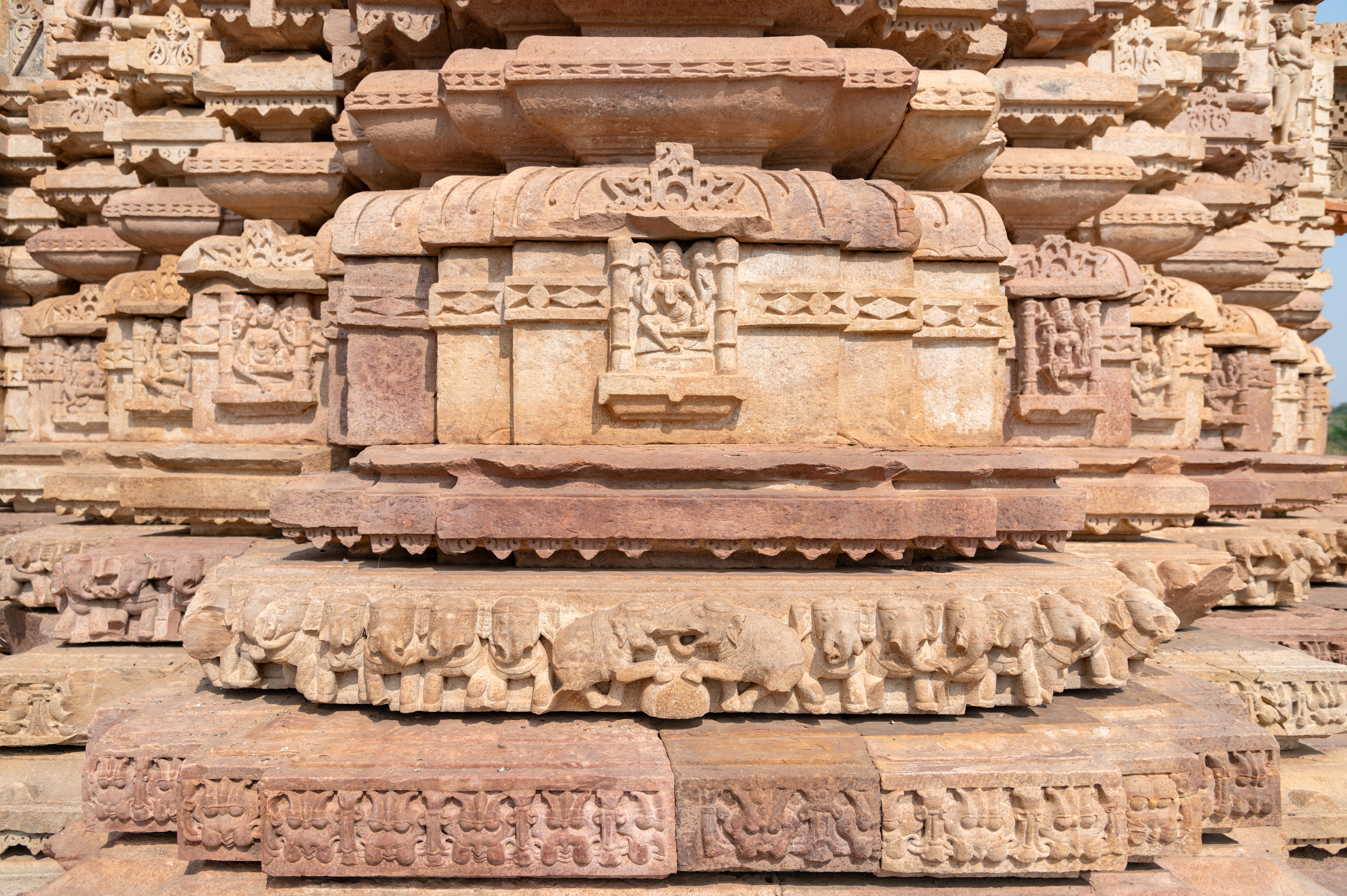 The closer view of the vedibandha (basal mouldings) of the Undeshwar Temple shows the gajathara moulding (elephants in the band). This moulding is commonly found in grand Bhumija temples. The kumbha (pot) moulding is adorned with miniature niches containing figures of deities. The kalasha (pitcher) molding is also intricately carved with a band featuring a diamond motif.