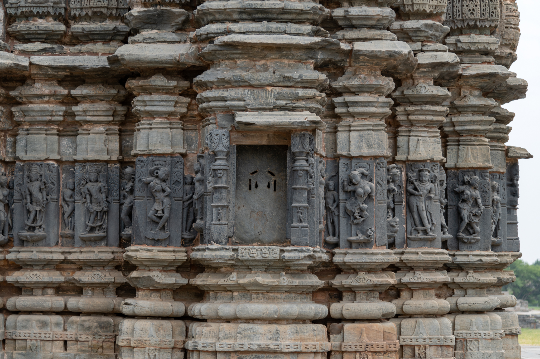 View of the west-facing jangha (wall) of the Jain Temple where the bhadra (central projection) niche is empty but the intermediate and corner projections have sculptures on both its sides. The intermediate projections have depictions of dikpalas (deities of the cardinal directions). The recesses have depictions of ascetic figures.
