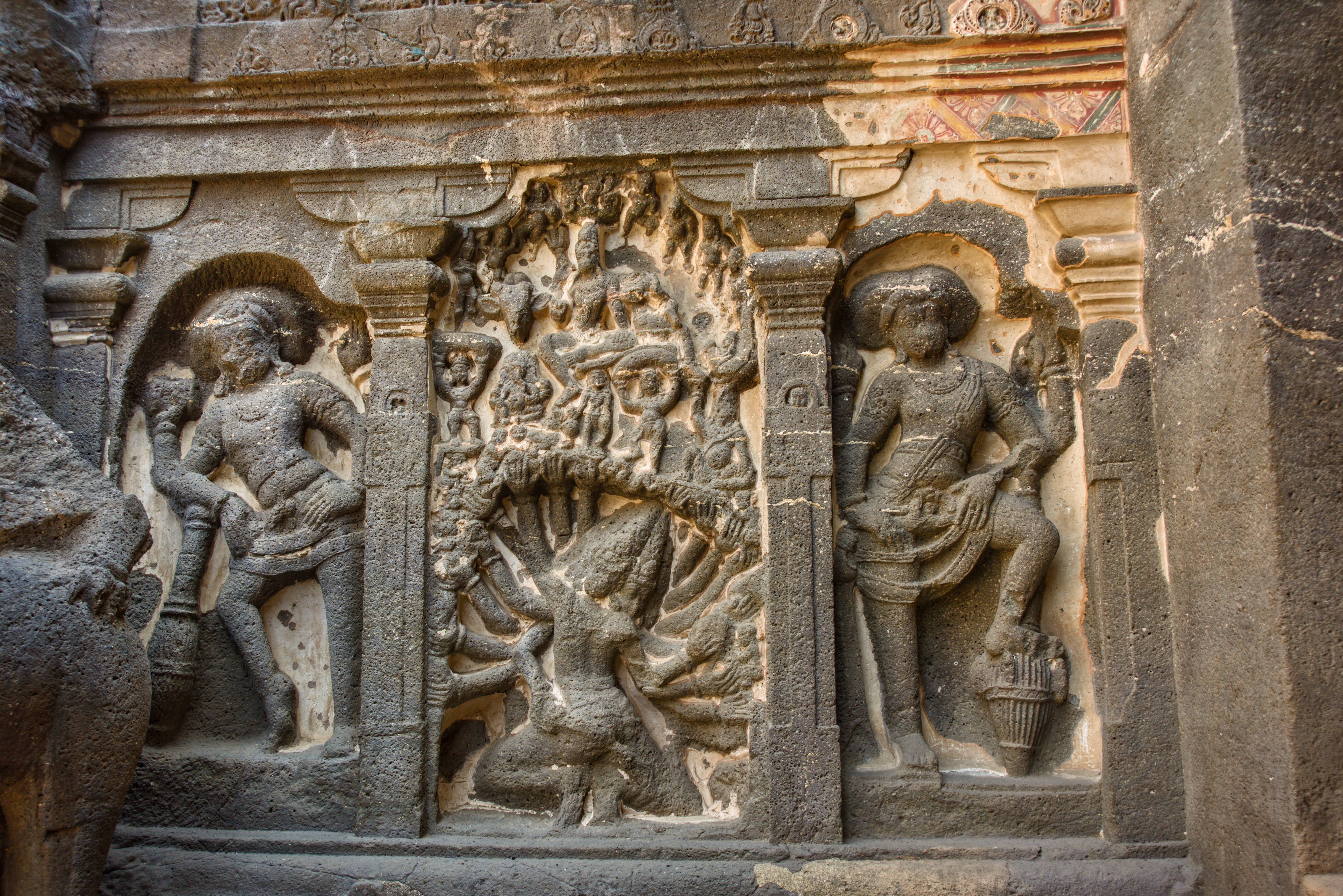 Ellora, Kailasanath, Ravana lifting Kailasa Mountain Öffentlichkeit Deposited
