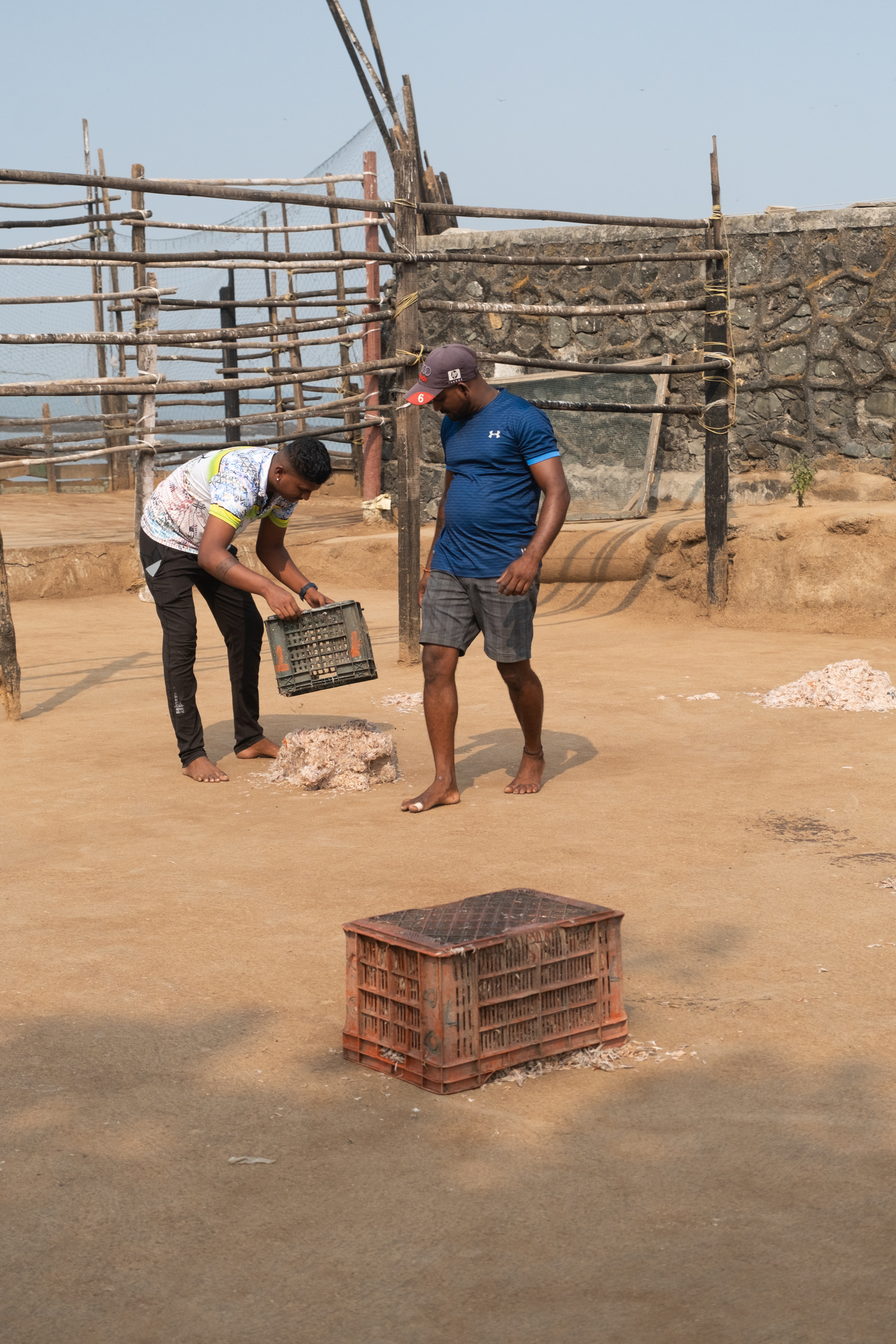 The fish are spread evenly on the open ground, which is specially coated with cow dung. Cow dung contains antibacterial properties that help disinfect and sanitize surfaces. Coating floors with cow dung can help deter pests such as flies, mosquitoes, and ants, thereby reducing the risk of infestations and associated health hazards.