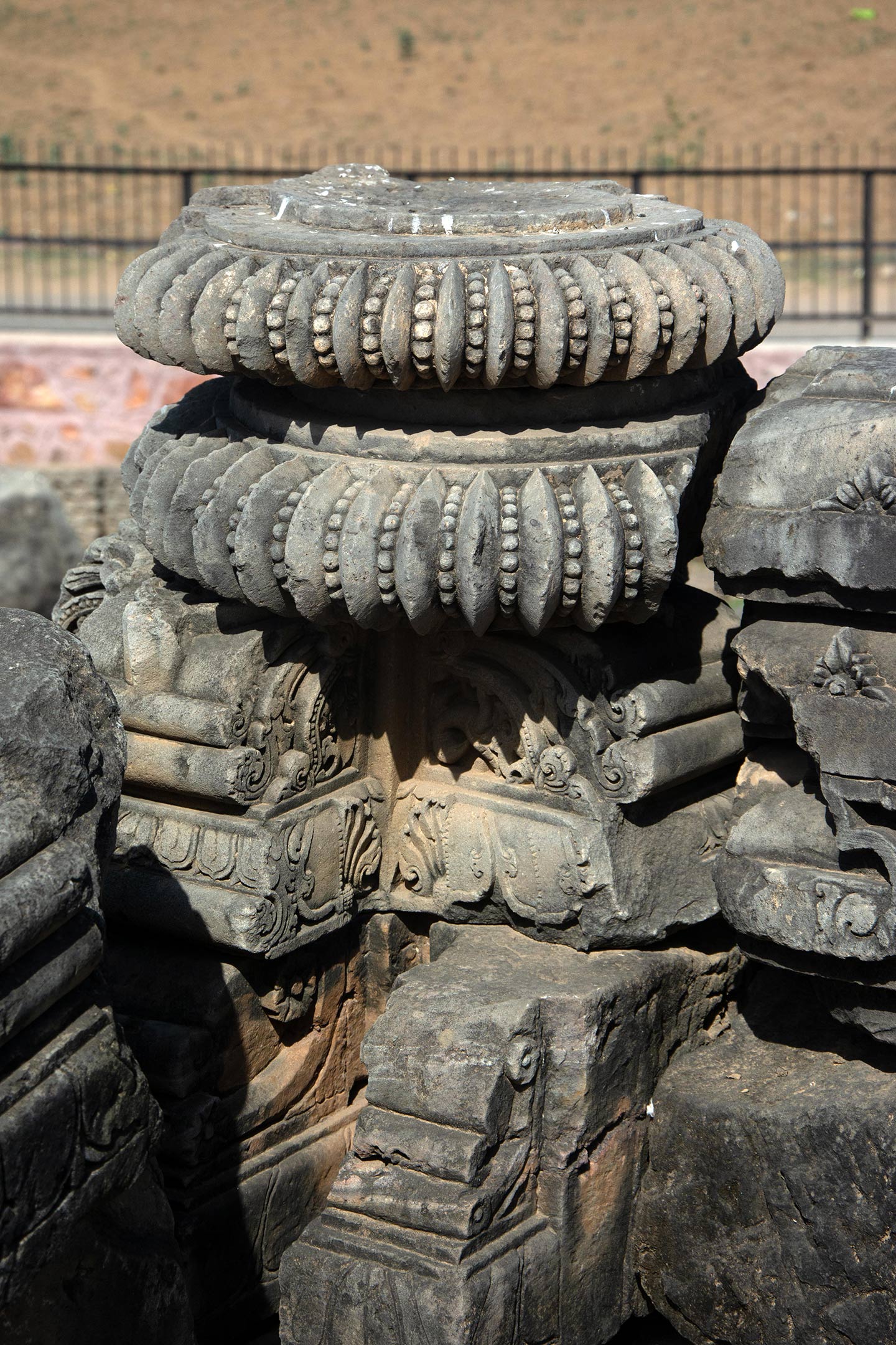 Broken fragments and debris from the original temple assembled on the north face of the adhisthana. Most fragments assembled here were once part of the shikhara of the original temple, other subsidiary structures, and associated parts like the amalaka (notched disc) as seen here.