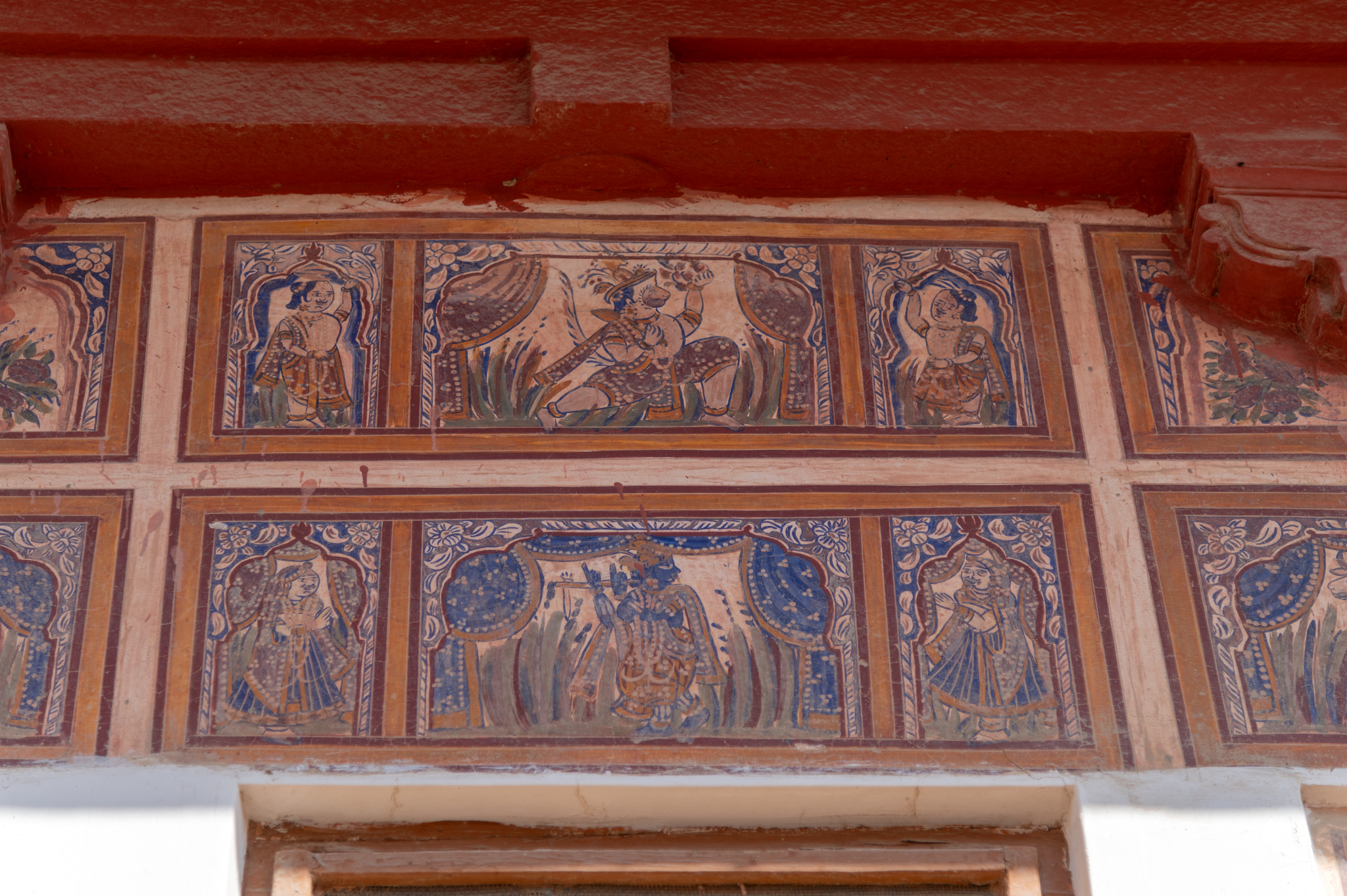 Paintings above the doorway in the exterior walls of the Bhandasar Temple. There are two sets of paintings, each consisting of a central rectangular block flanked by square blocks. The lower set has the painting of Murlidhara Krishna at the centre with two attendants in the flanking squares. Similarly, the upper set is a painting of Hanuman at the centre, carrying the mountain of Sanjeevani. Murlidhara Krishna is shown as blue-skinned wearing a pitambar (yellow lower garment).