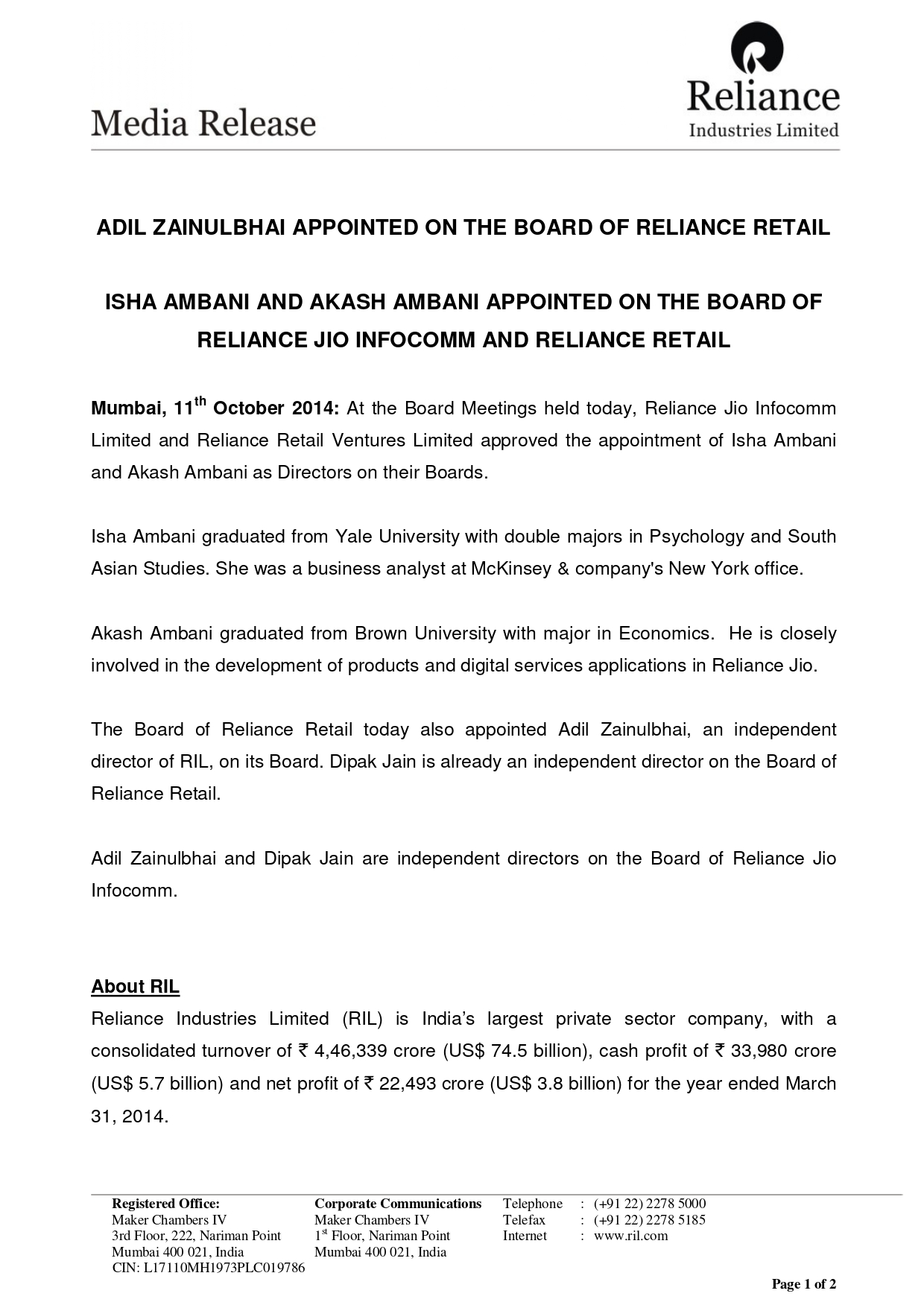 Appointment of Isha Ambani and Akash Ambani as Directors Pubblico Deposited