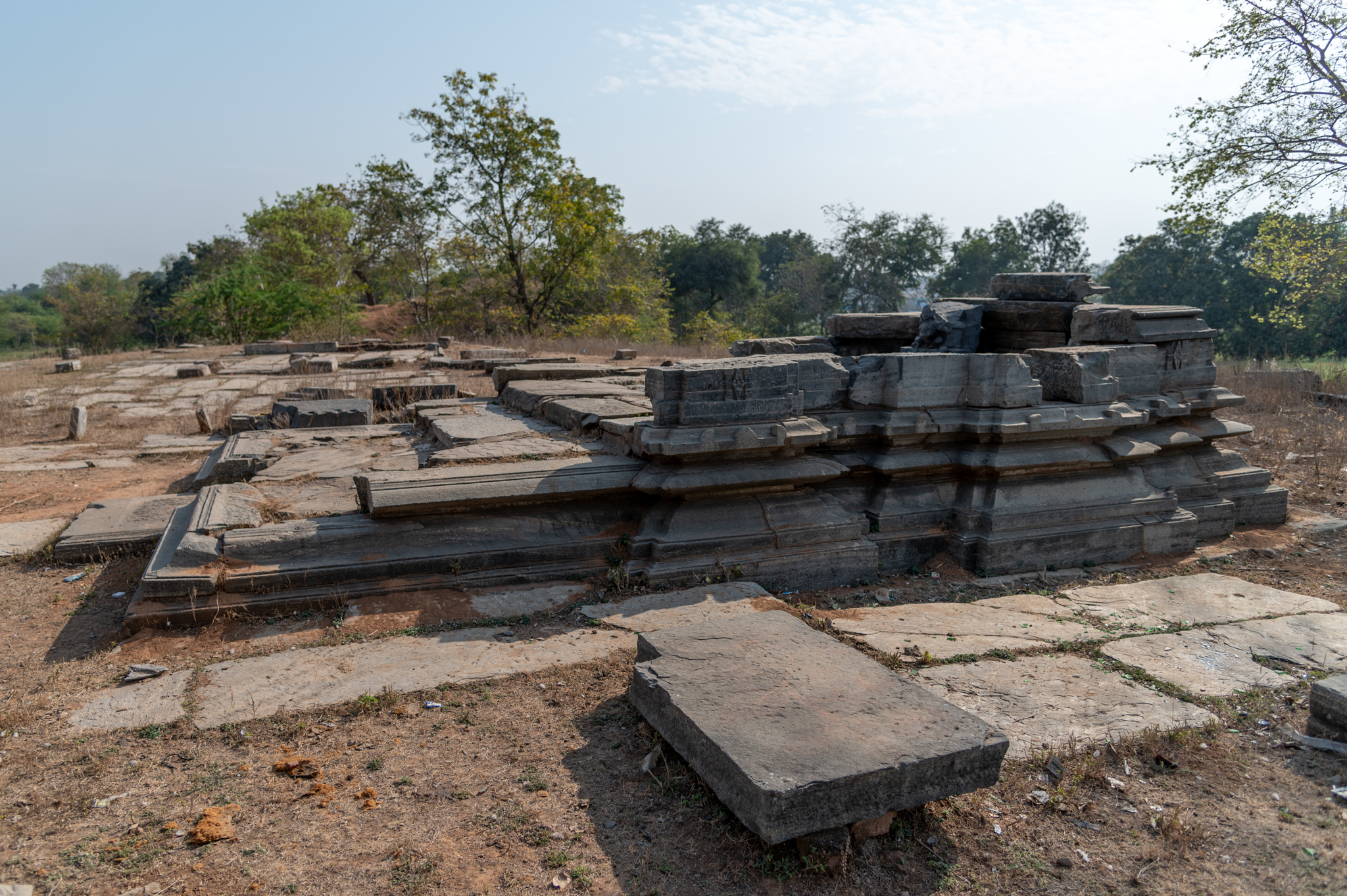 The remains of a triratha (three ratha or vertical projections on each side) single-shrine temple to the southwest of the Mandaleshwar Mahadev Temple. The ruined temple consists of only a garbhagriha (sanctum sanctorum) and a mandapa (pillared hall) in its plan. Only the plinth of the temple ruins has survived. The temple has a vedibandha (basal mouldings) consisting of mouldings like khura, kani, and kumbha.