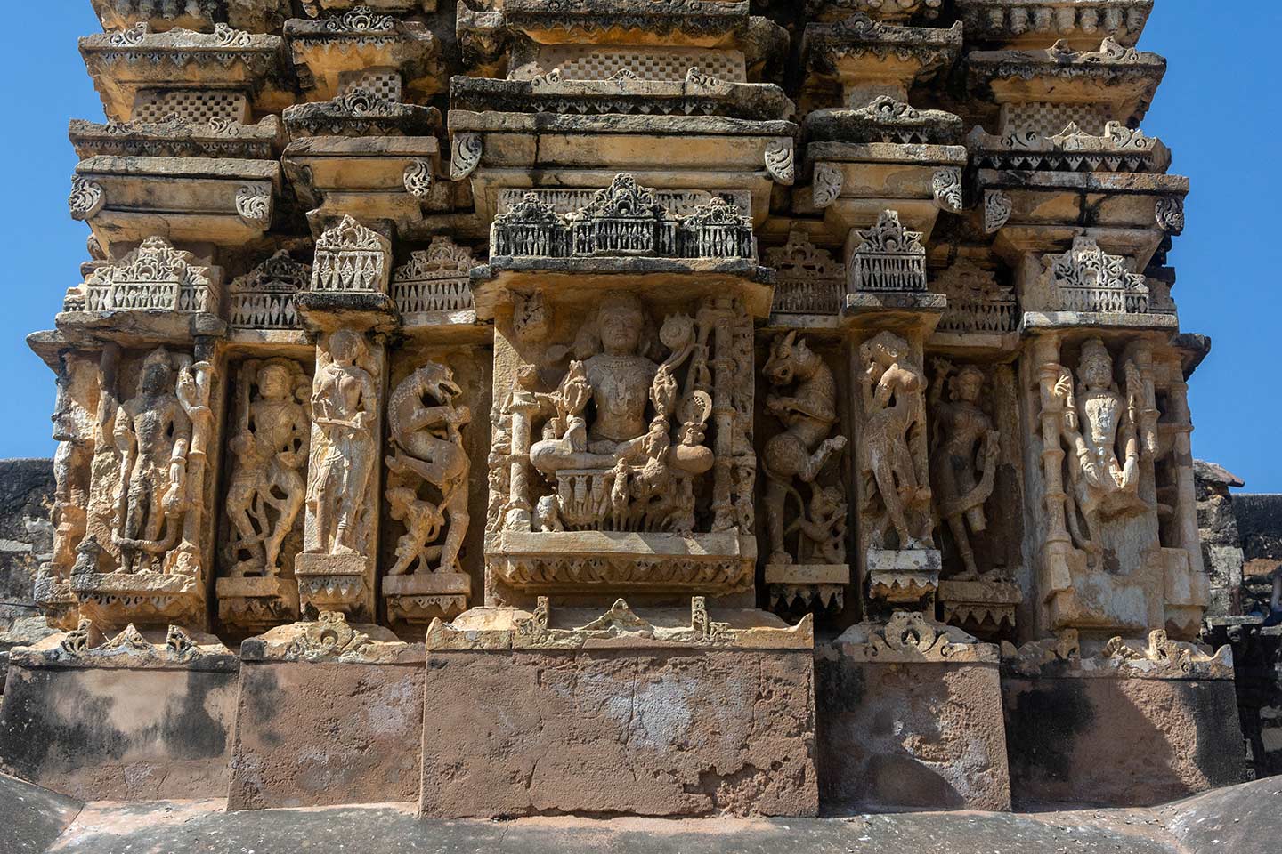 This is the east-facing elevation of the central shrine in the Neelkanth Mahadev Temple. The bhadra (central projection) image on the exterior wall facing east, contains a unique composite image called the Harihararka (or Hariharapitamaharka), which is a depiction of Shiva, Vishnu, and Surya (and plausibly Brahma) incorporated into one sculpture. The three-faced figure is shown sitting on a chariot of seven horses, holding the attributes of all its representative deities.