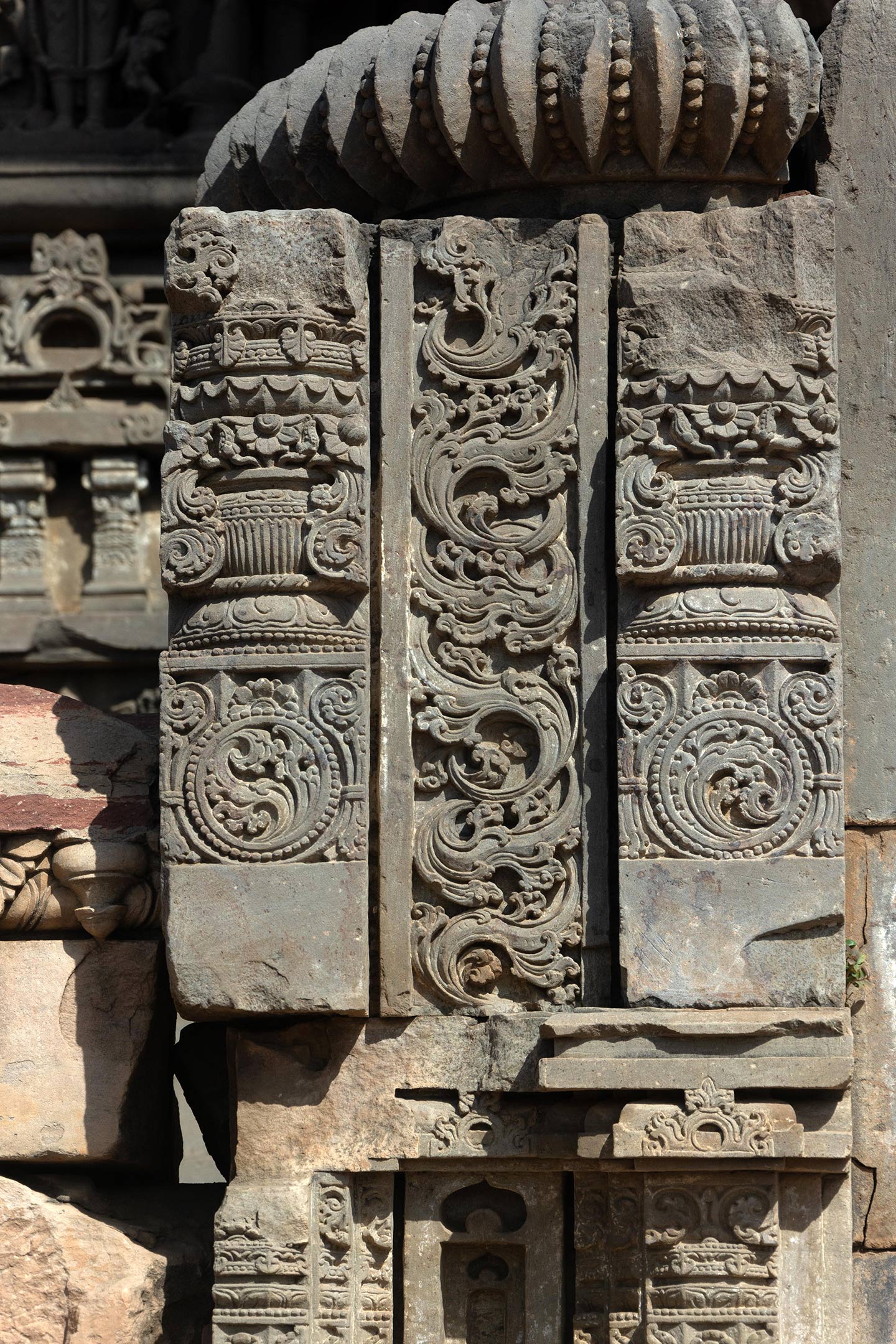Debris from the original temple was salvaged when the current temple was reconstructed in the 1940s. These have been assembled in parts to form the jagati (raised platform). This vertical fragment is topped with a broken amalaka (notched disc). However, it is not known where they were located in the original temple. A broken section of the block features two pillars divided vertically in three sections. The kalpa lata (creeper) motif features at the base, the purna kalasha (pot of prosperity) in the central part. The top part is damaged and blooming lotuses separate the three parts. In the central part, a flowing kalpavrisksha (tree of life) motif is carved in great detail.
