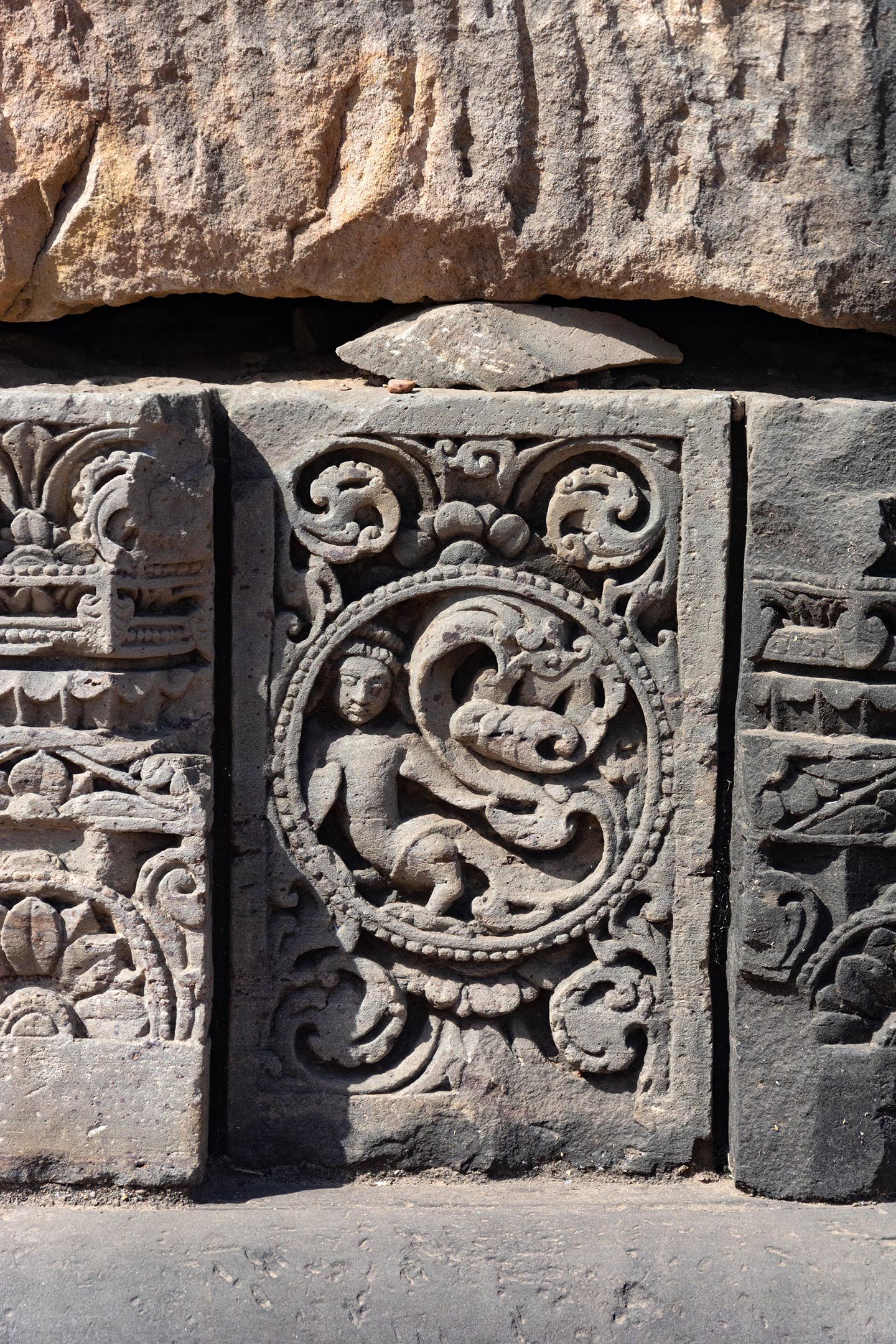 Tablet-like plaques are placed on the adhisthana (facing east). These plaques depict various types of flora and fauna as well as hybrid creatures like kinnara, vyala, and makara. The plaques are tightly arranged, richly detailed, and deeply carved, creating contrasting shadows that make the artwork look three-dimensional in sunlight. The central artwork of the plaque is in the form of a circular medallion surrounded by a foliage motif. The medallion shows a kinnara (having the upper body of a human male and the lower body of a bird) with its tail forming a creeper motif. Kinnaras and kinnaris (having the upper body of a human female) are divine musicians who are skilled in dance, music, and poetry. The rest of the plaque surface is decorated with ardha padma (half lotus) and kalpa lata (creeper) motifs.