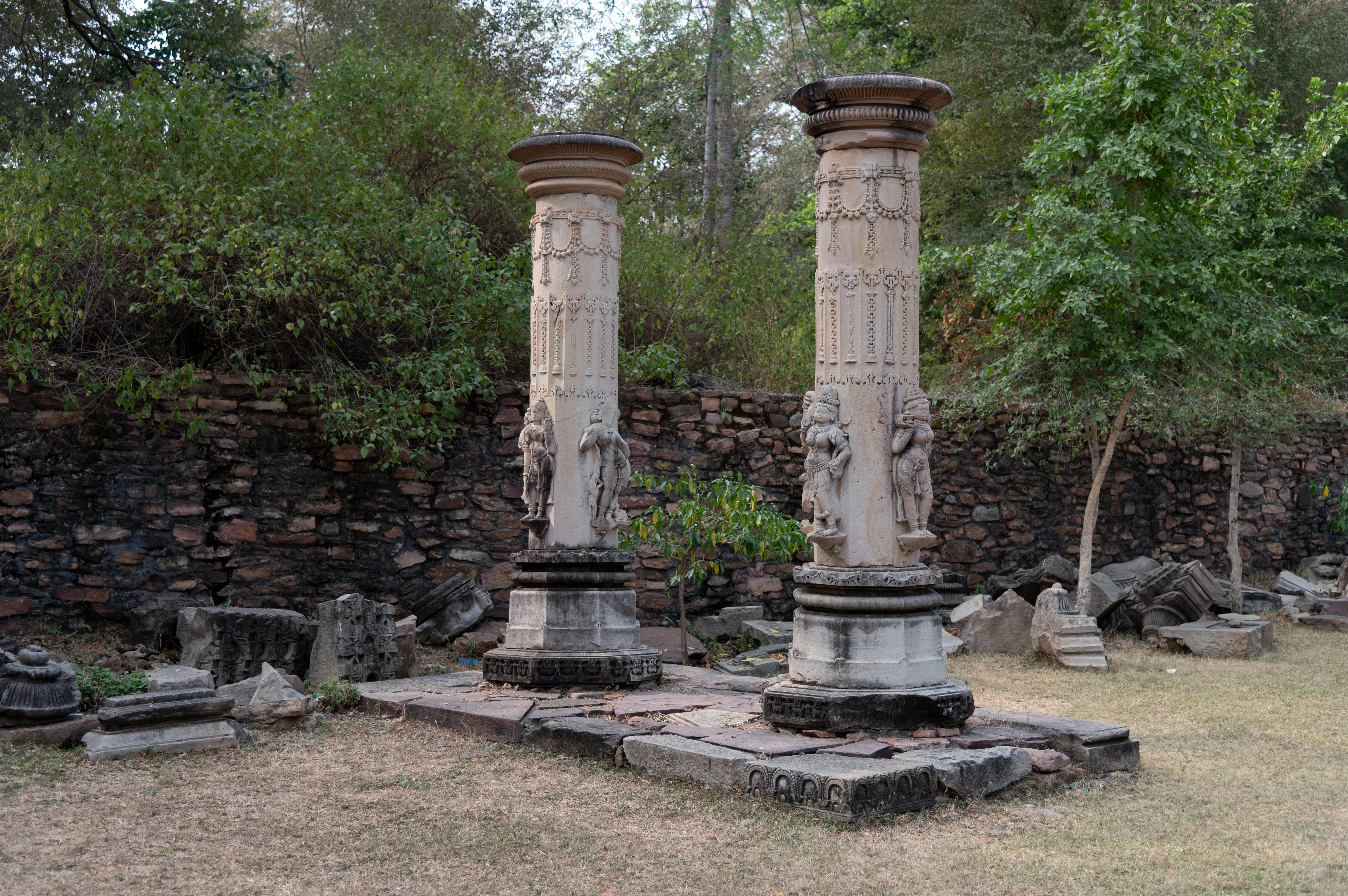 The temple complex has an ornate torana (ornamental gateway). While the arch of the torana is broken, the pillars are still well-preserved. Each pillar depicts three female figures and one male figure on the lower octagonal part of the shaft. The upper portion of the pillars is adorned with loops and chains of bells.