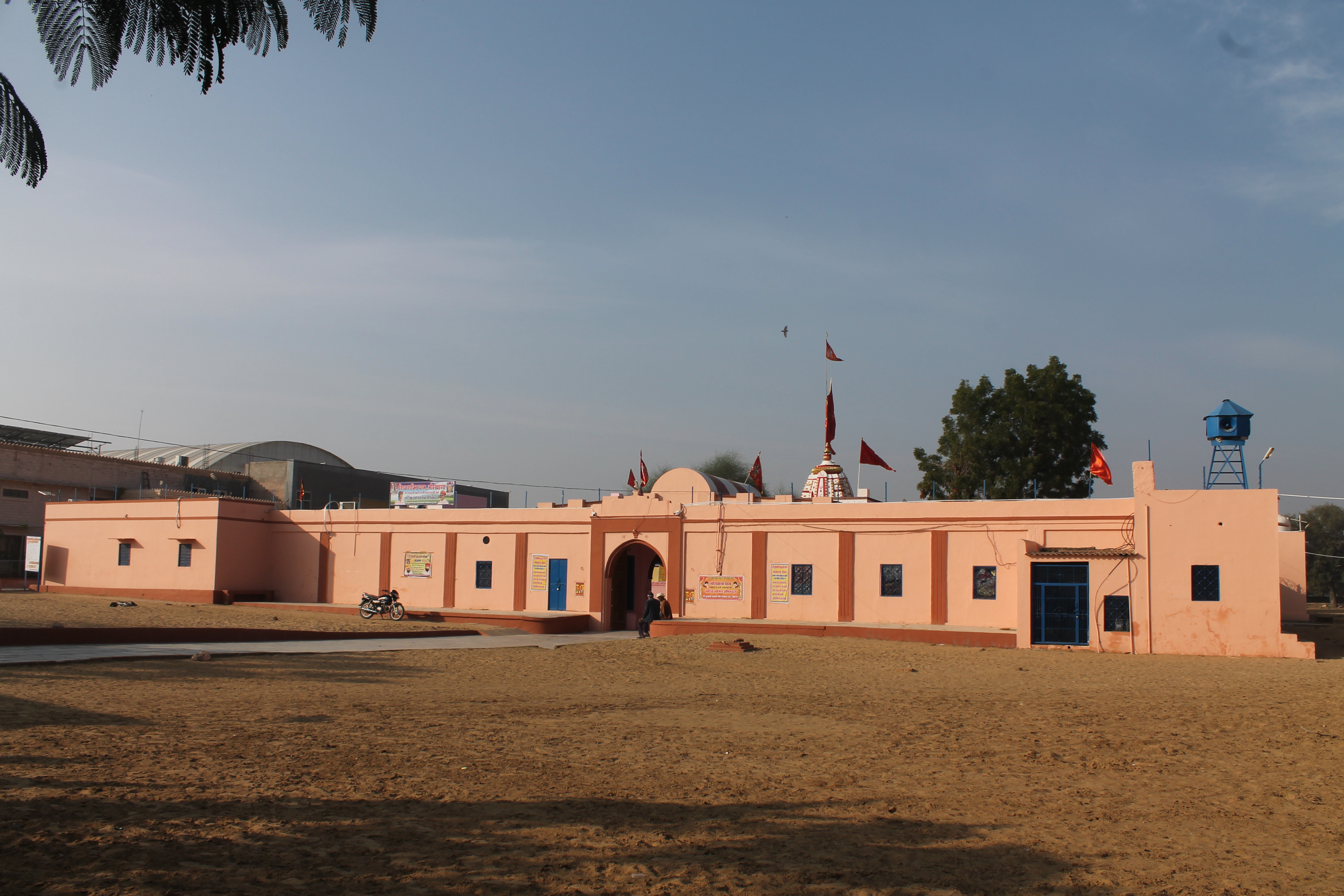 View of the modern dharmashala (a charitable public rest house or shelter) rooms added surrounding the verandah (open-air hallway or porch) of the Suswani Mata temple complex. The shikhara (superstructure) of the main temple and the flagstaff of the centrally located old temple are visible from the open ground in front of the main gate.