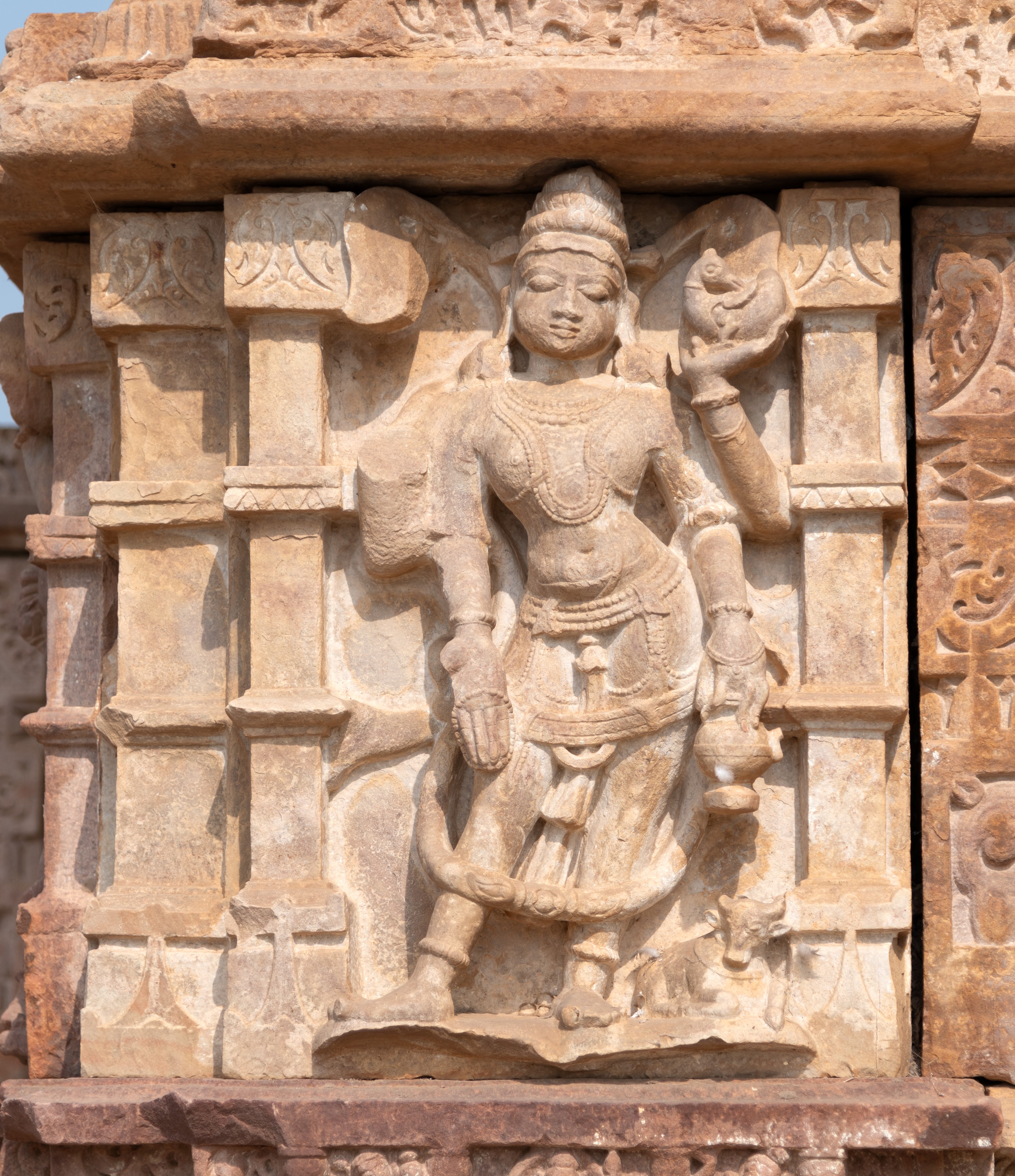 Yama, the God of justice and guardian of the south direction, is depicted holding a rooster and a kamandalu (water pot). One of his hands is in varada hasta (boon-giving gesture). He is adorned with jewels and wears a long garland. At the bottom left is a carving of a buffalo.
