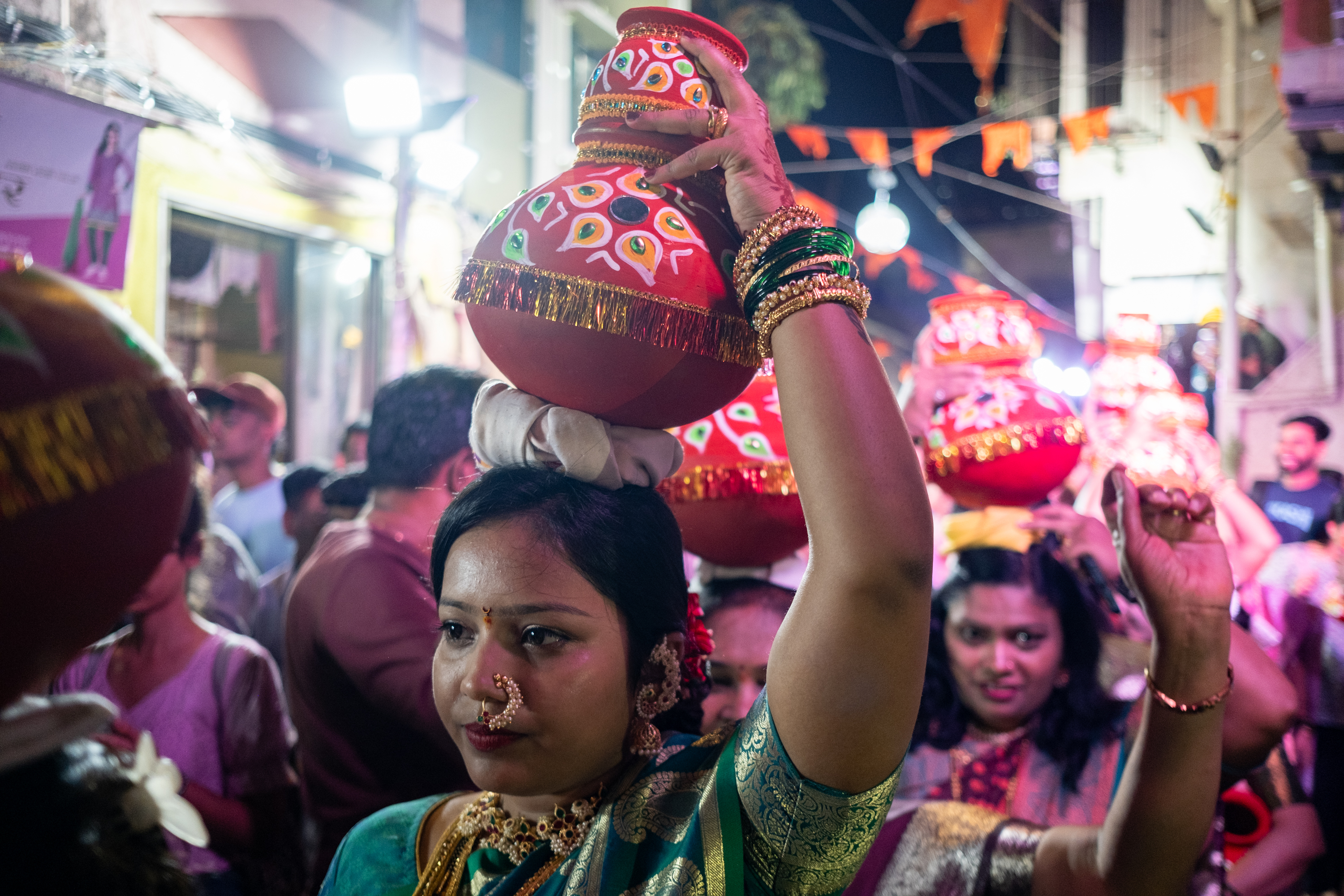 Women take out a procession, carrying earthen pots on their heads. They circle the effigy five times before breaking the pots in the fire. This tradition traces back to a time when ceremonial fires were carried in earthen pots.