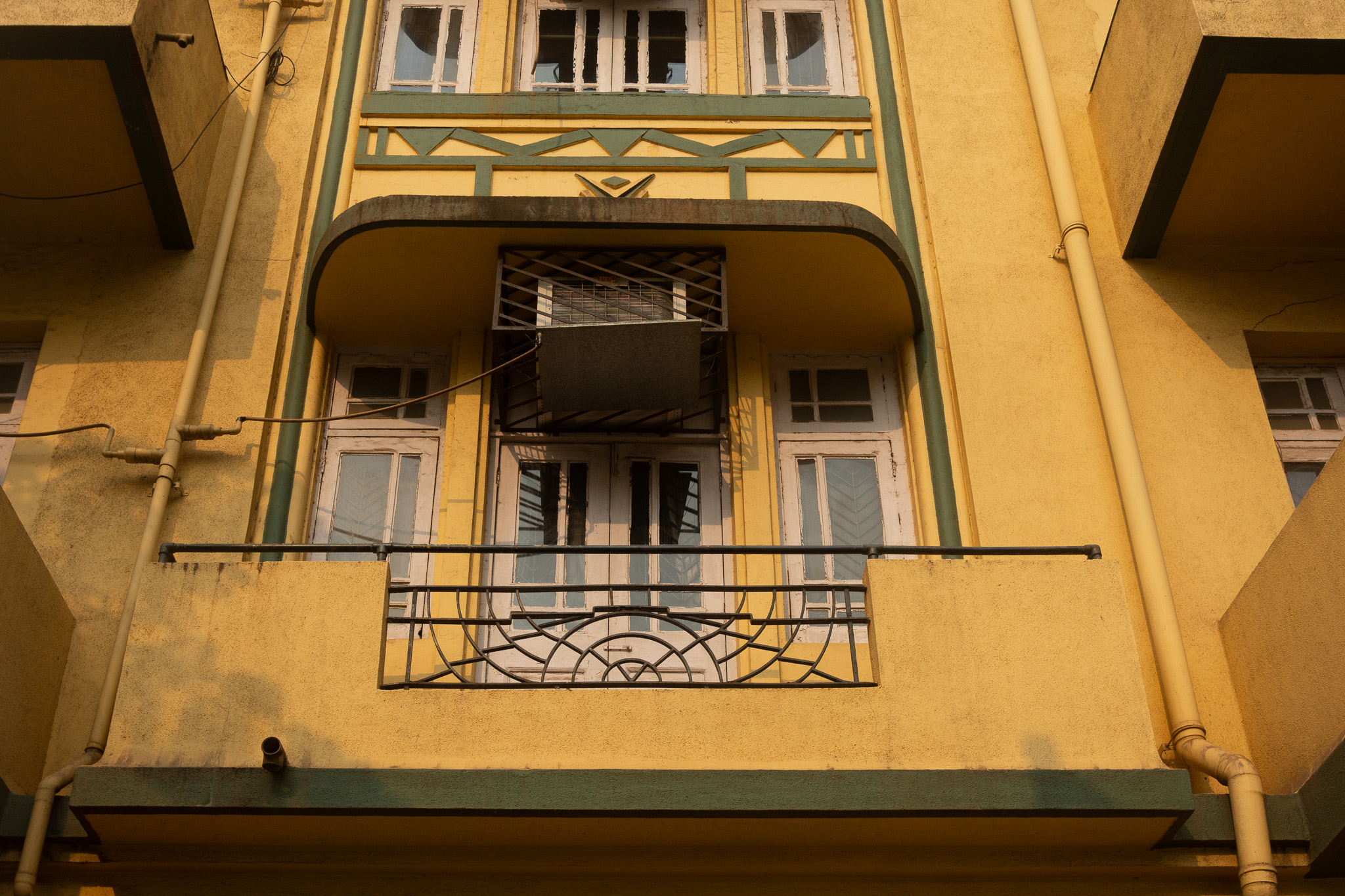 Geometric sunburst rays on balcony grille, Shiv Shanti Bhuvan.